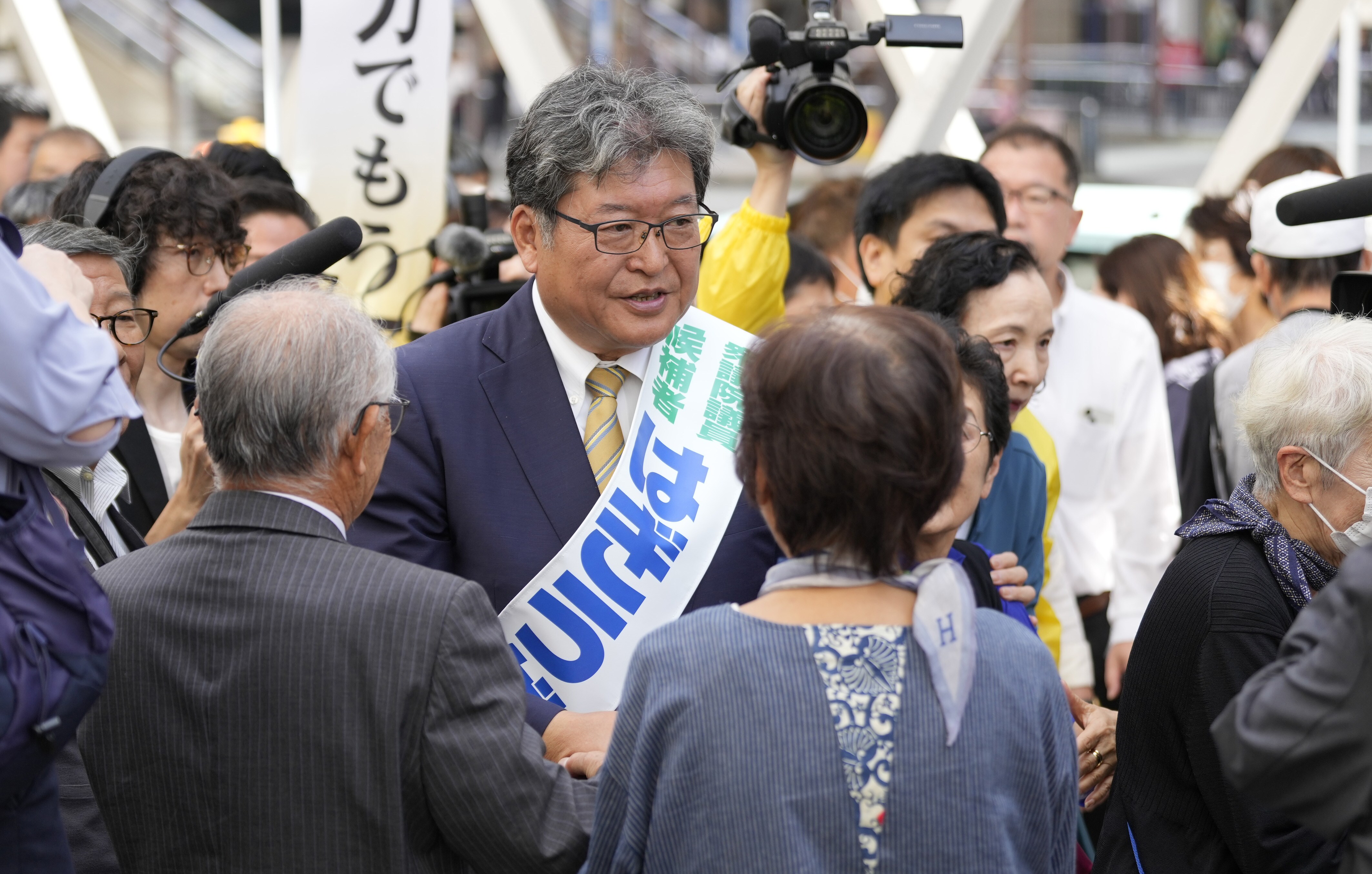 Koichi Hagiuda greets his supporters in Hachioji. Photographer: Toru Hanai/Bloomberg