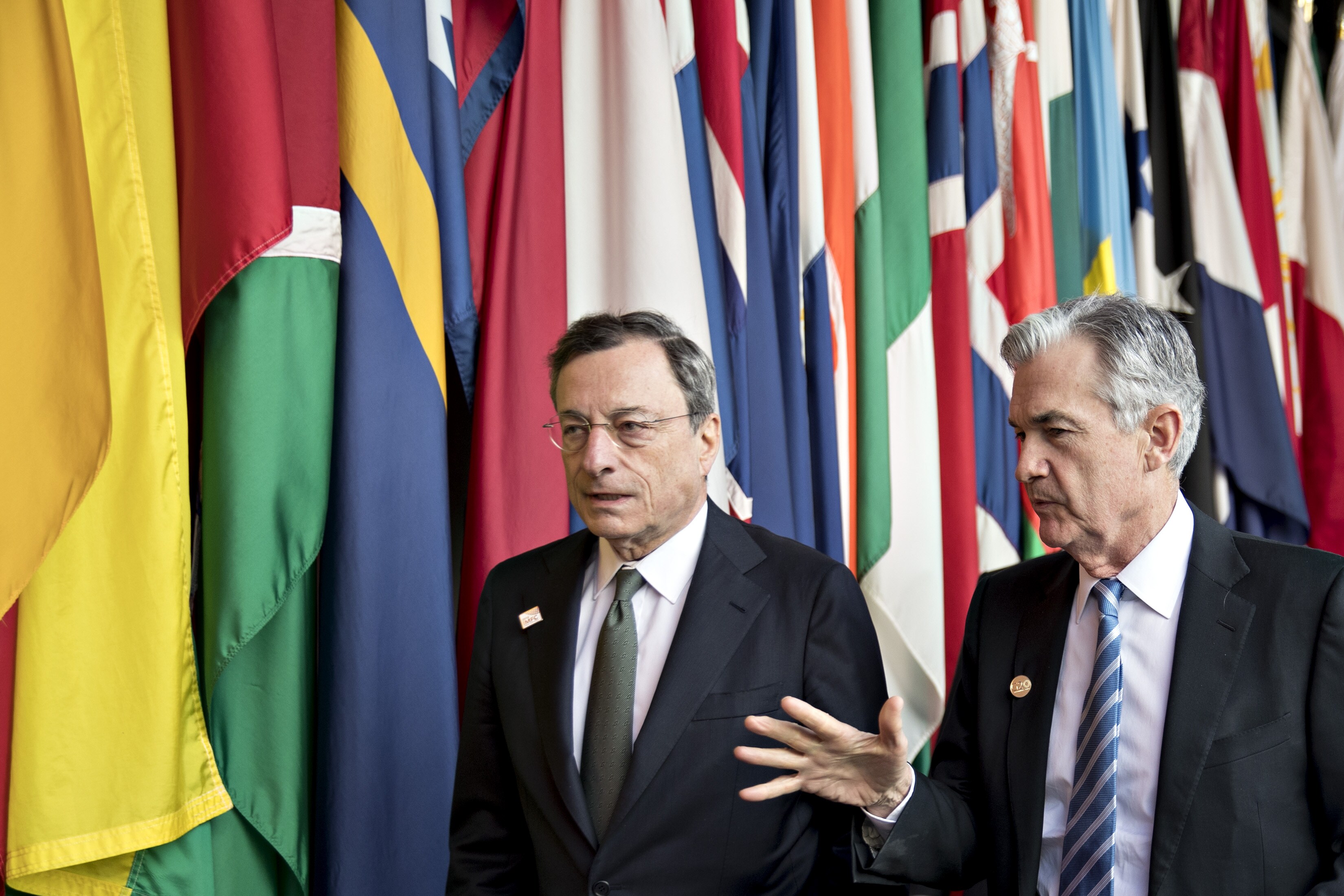 Jerome Powell, chairman of the U.S. Federal Reserve, right, walks with Mario Draghi, president of the European Central Bank (ECB). (Photographer: Andrew Harrer/Bloomberg)