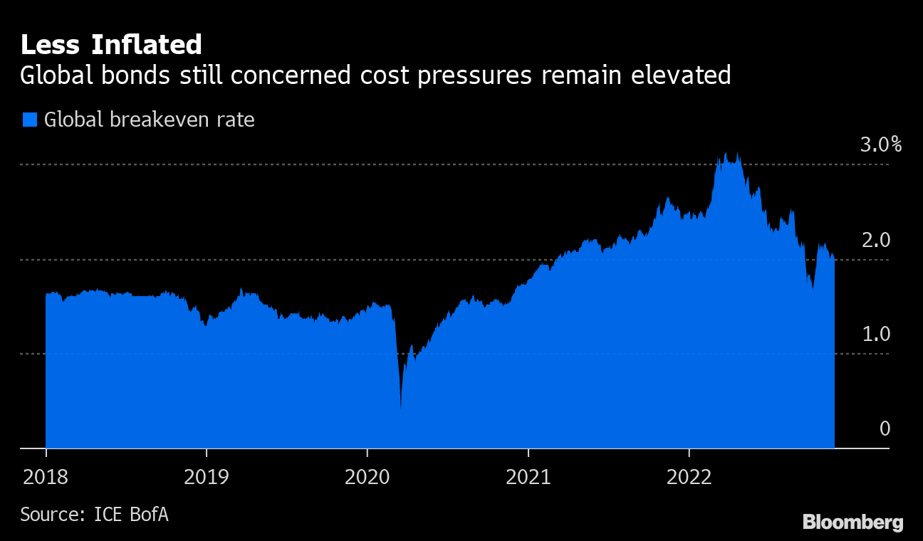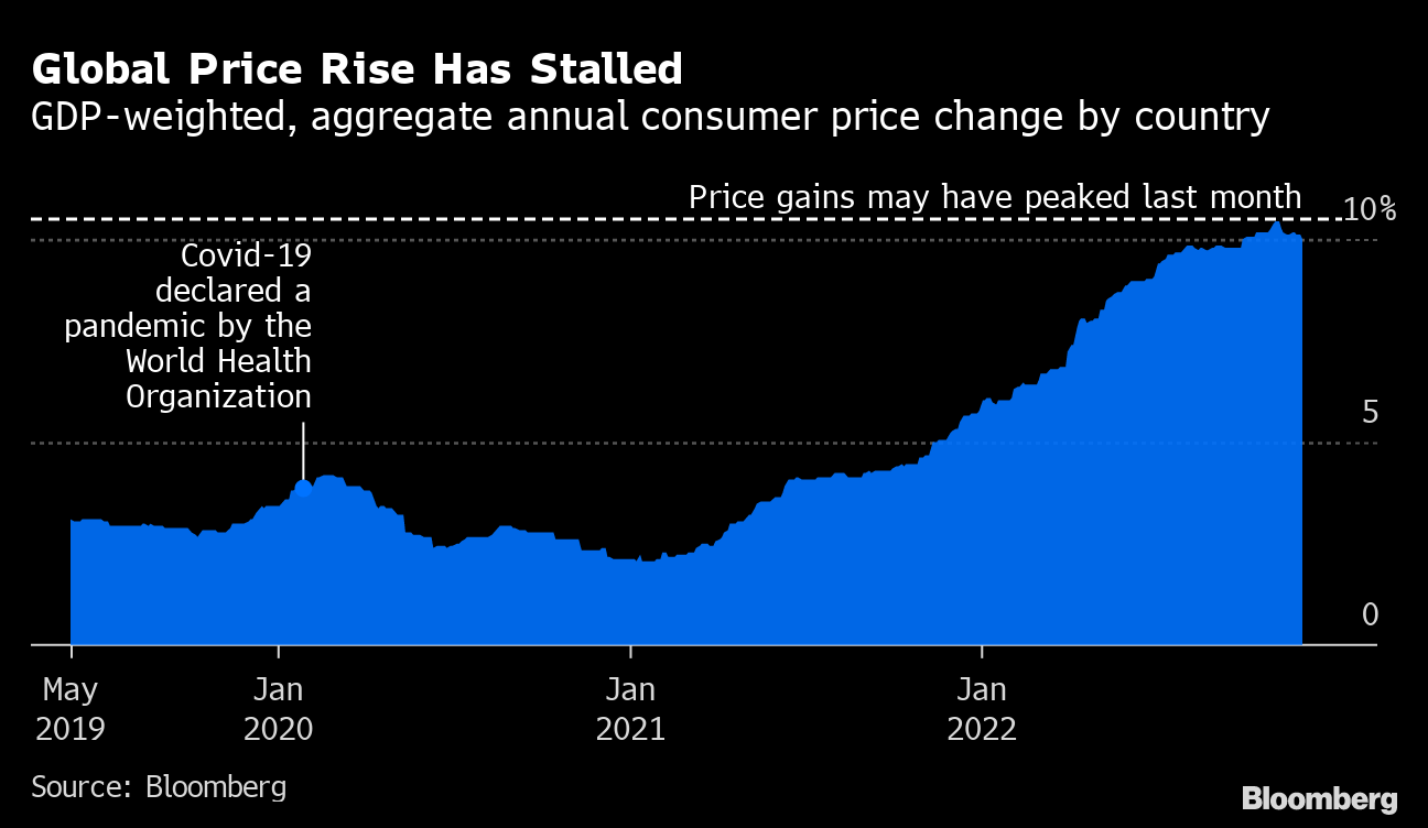 (Bloomberg) -- Global inflation is showing signs of having peaked, although a likely slow retreat from multi-decade highs means it will remain a bugbear for central banks into 2023.