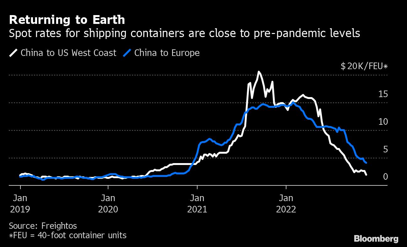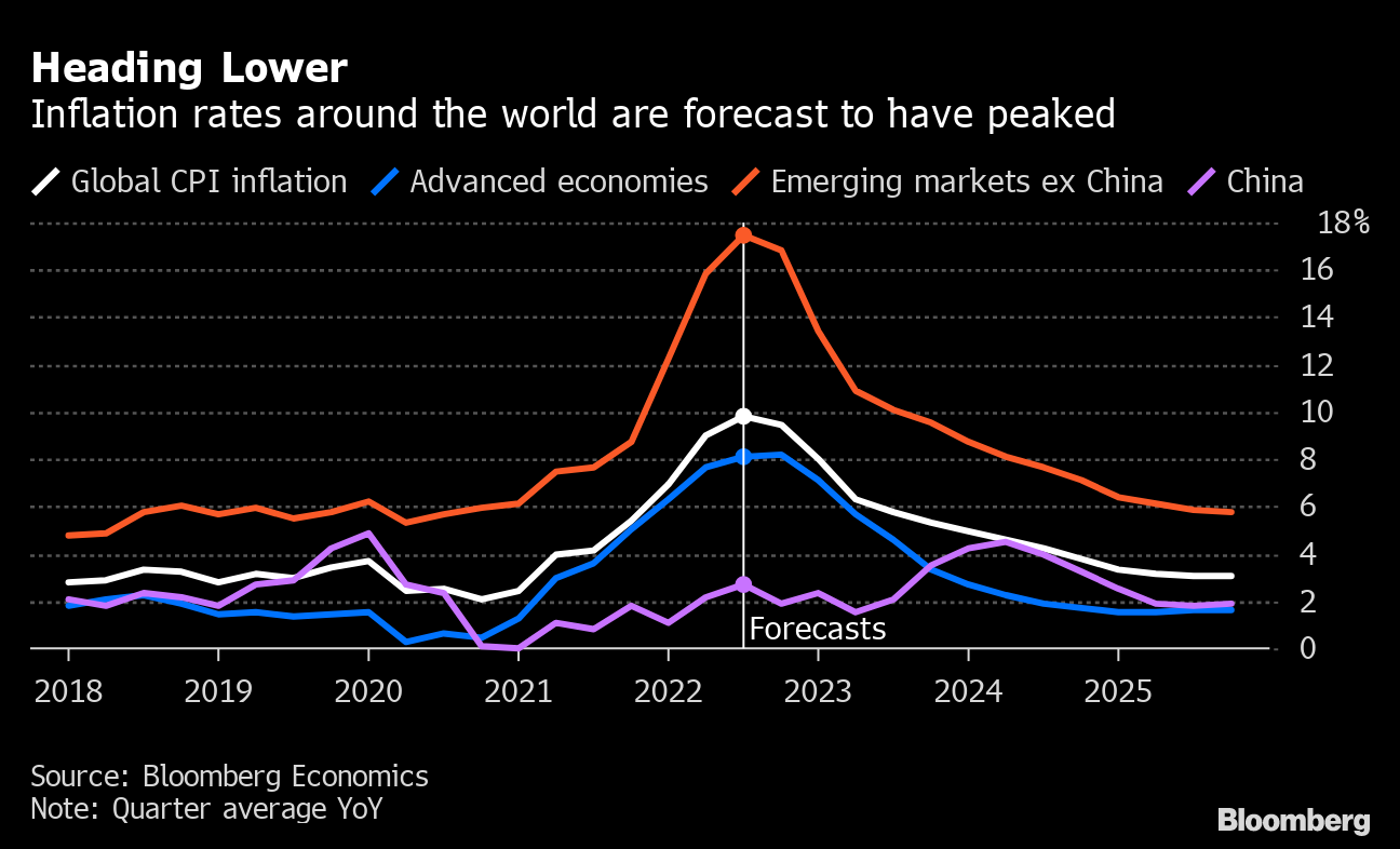 Such a backdrop helps explain why Bloomberg Economics estimates worldwide inflation topped out at 9.8% year-on-year in the third quarter, and is now headed to 9.5% in the final three months of the year and 5.3% at the end of 2023.