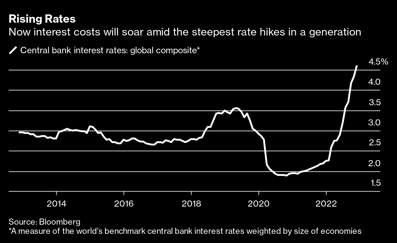 Also likely starting to have an effect, albeit on a lagged basis, are the higher interest rates pursued by central banks after inflation soared faster and for longer than they anticipated.