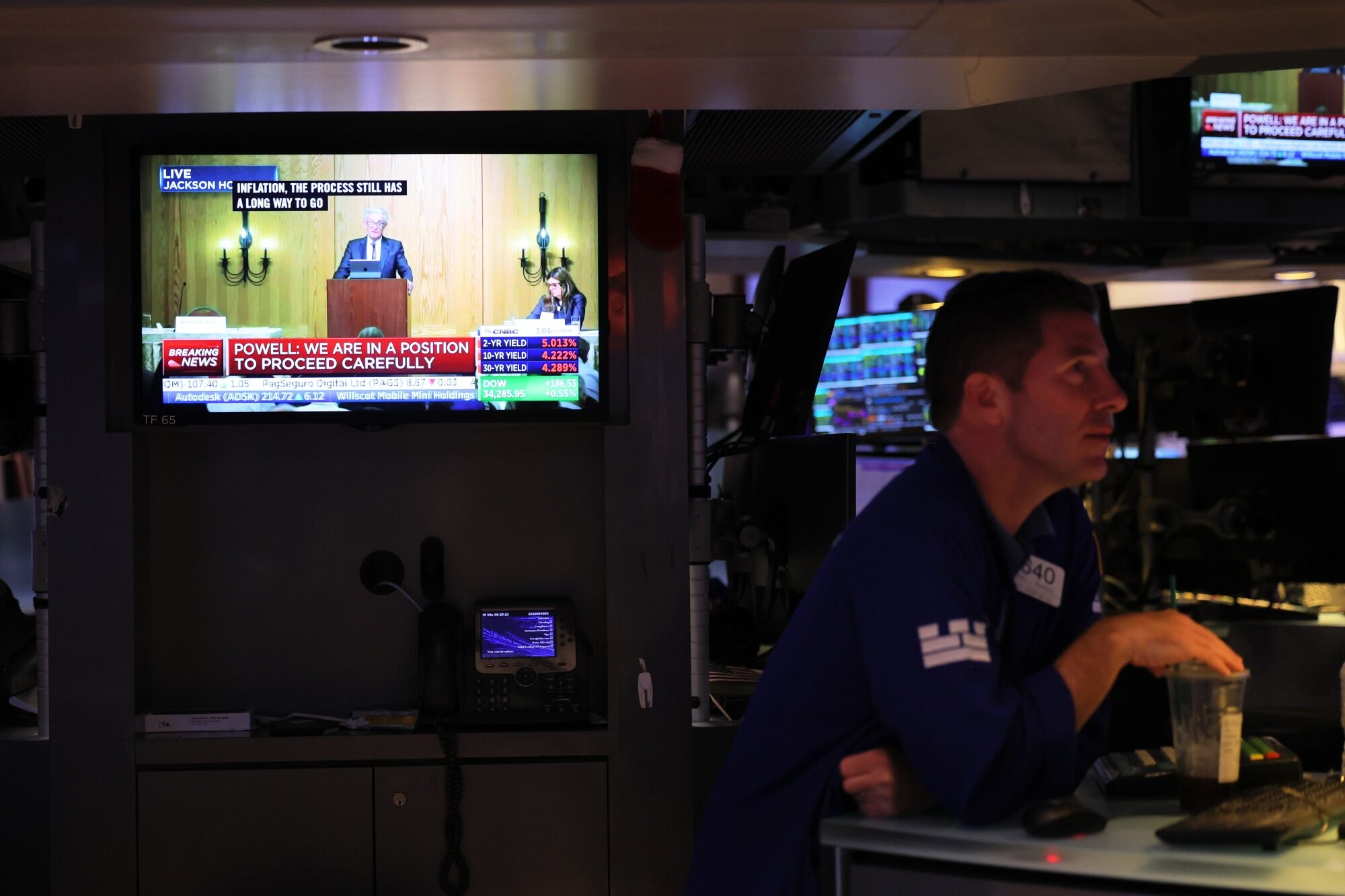NEW YORK, NEW YORK - AUGUST 25: Federal Reserve Chairman Jerome Powell’s speech is seen on a television screen as traders work on the New York Stock Exchange floor during morning trading on August 25, 2023 in New York City. Stocks opened higher as Wall Street prepared for Federal Reserve Chairman Powell’s speech at the Jackson Hole Economic Symposium. (Photo by Michael M. Santiago/Getty Images) Photographer: Michael M. Santiago/Getty Images