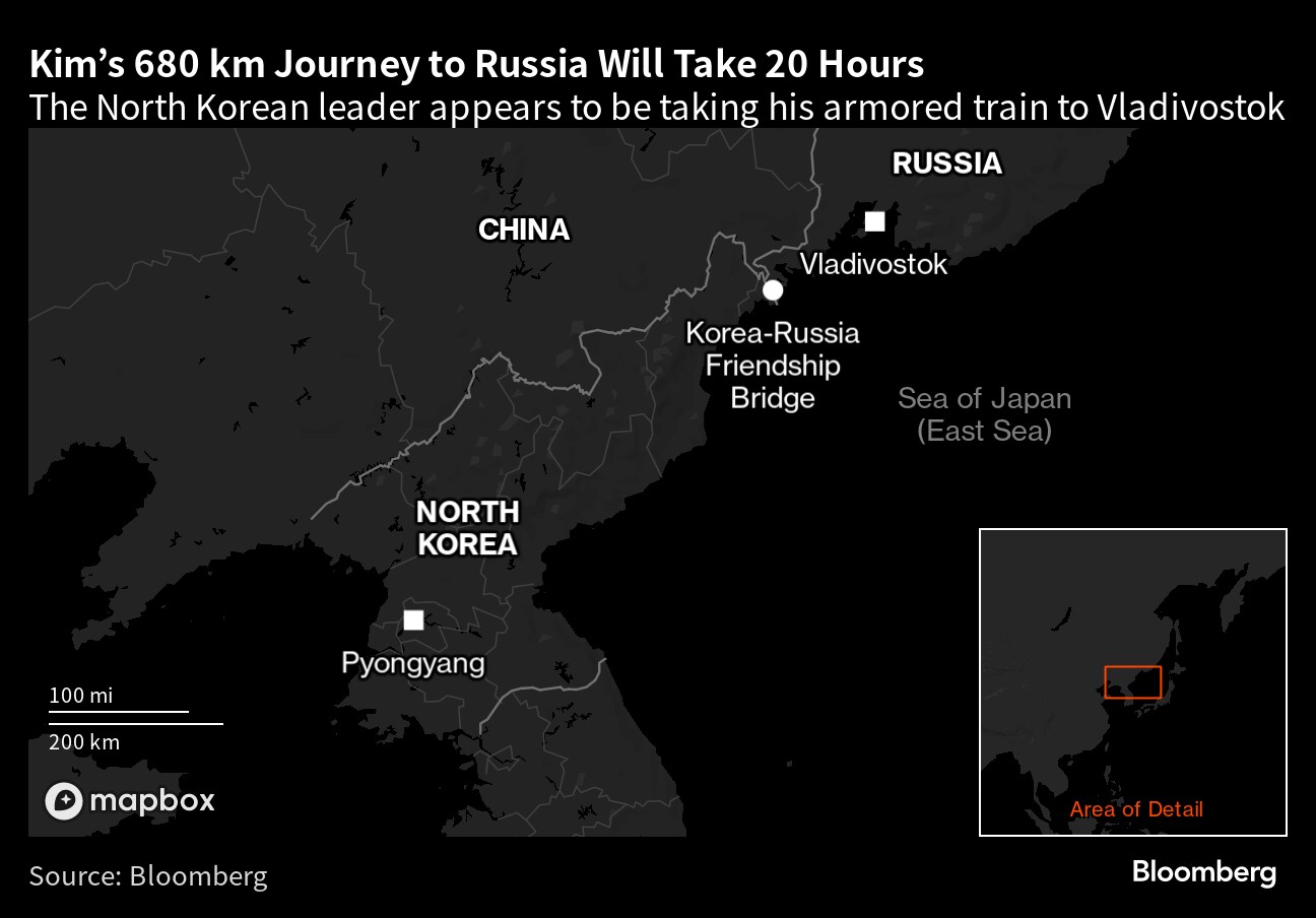 (Bloomberg) -- North Korean leader Kim Jong Un appears to have departed for Russia via his luxury armored train, South Korean media reported, ahead of expected talks with President Vladimir Putin in Vladivostok that the US said would touch on arms transfers to help the Kremlin's war machine.