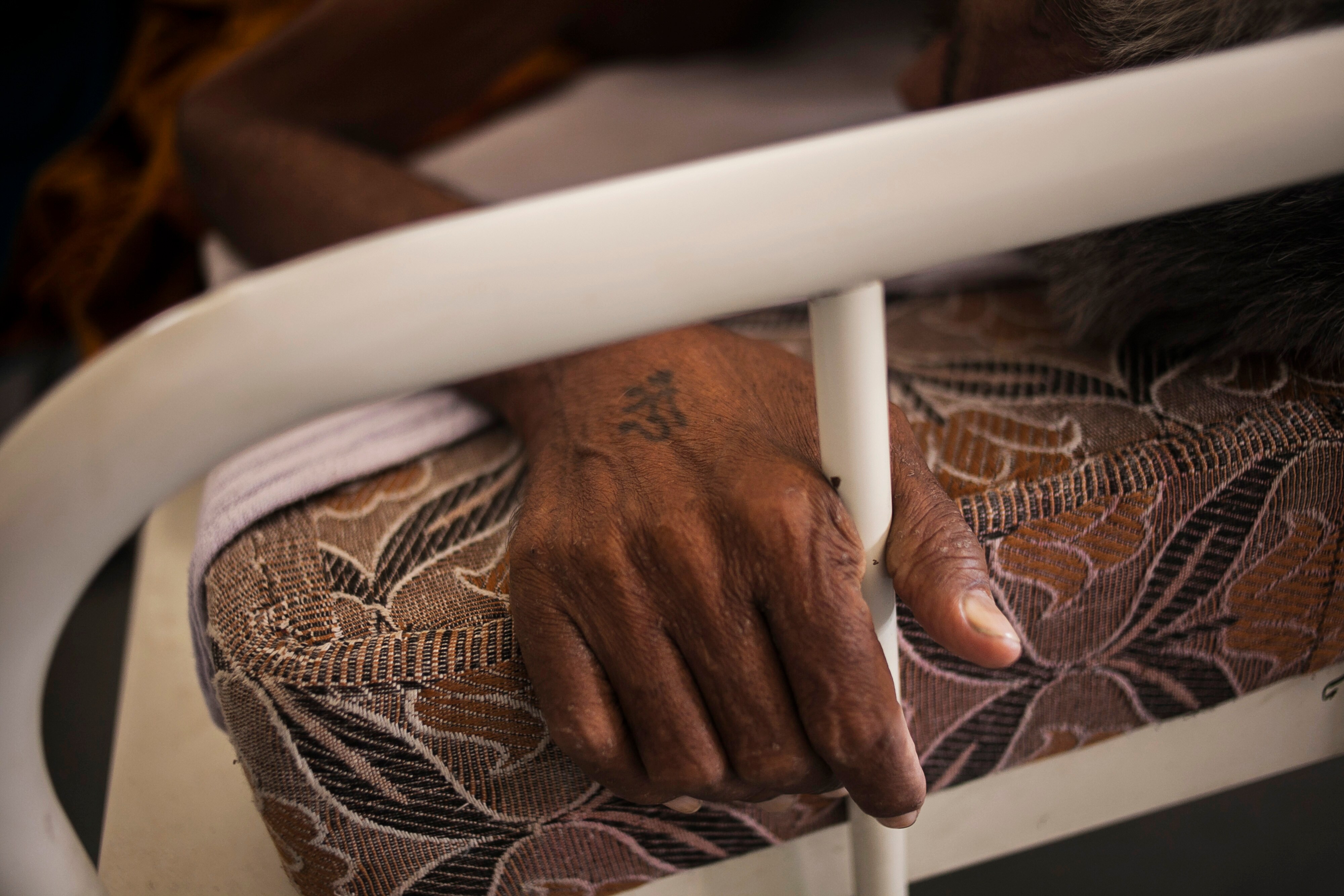 A patient holds a bed railing after a surgery in a general ward at the Acharya Tulsi Regional Cancer Treatment & Research Institute in Bikaner, Rajasthan