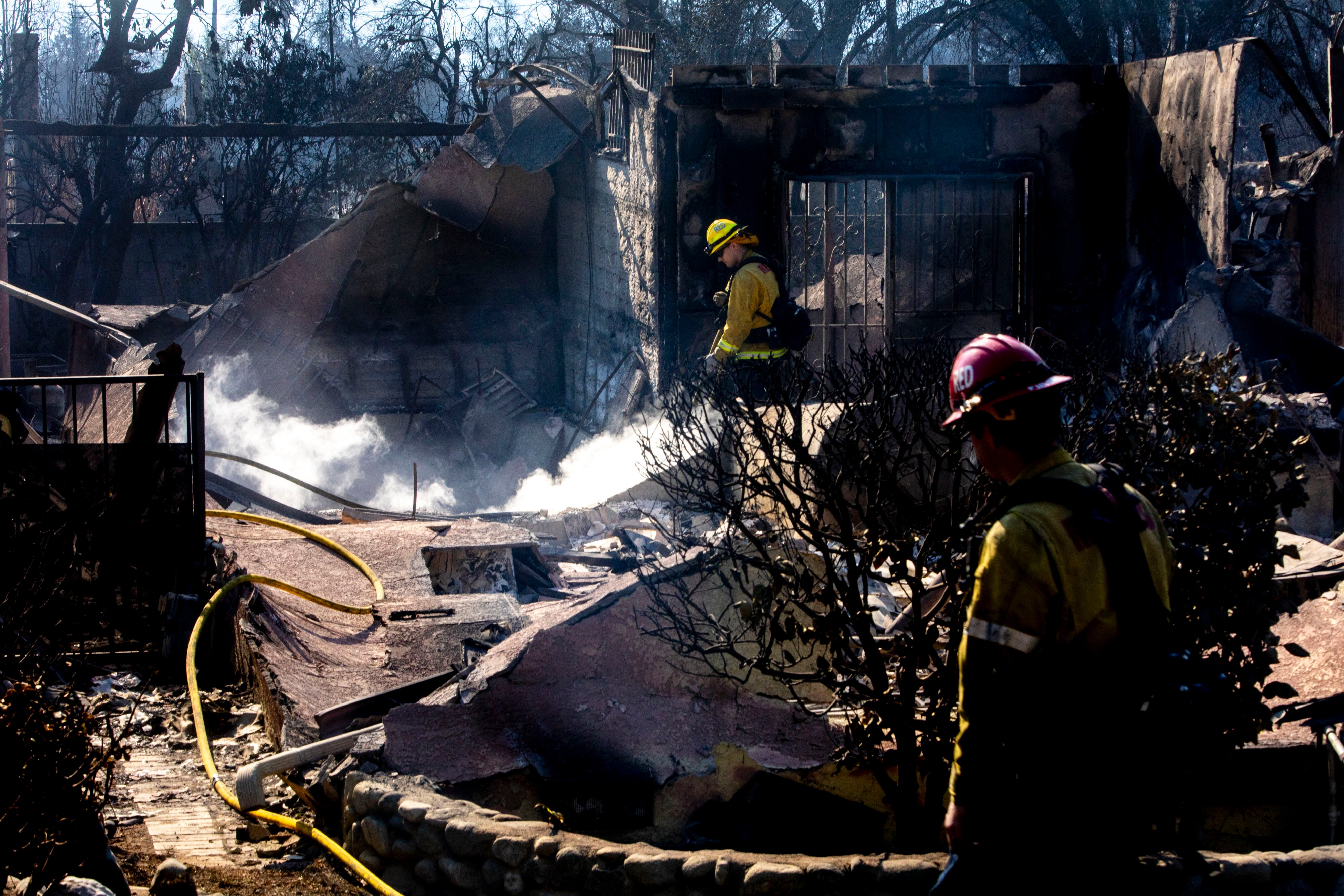 Firefighters extinguish hot spots in burned houses in the aftermath of the Eaton Fire in Altadena.