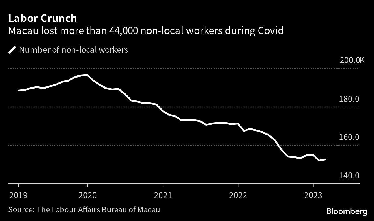 More than 44,000 non-local employees have left Macau since early 2020, leaving a gaping hole in the workforce even as China ending its Covid Zero policy fuels a travel boom not seen since 2019. The gaming hub relies on the mainland and Hong Kong for over 90% of its tourists.