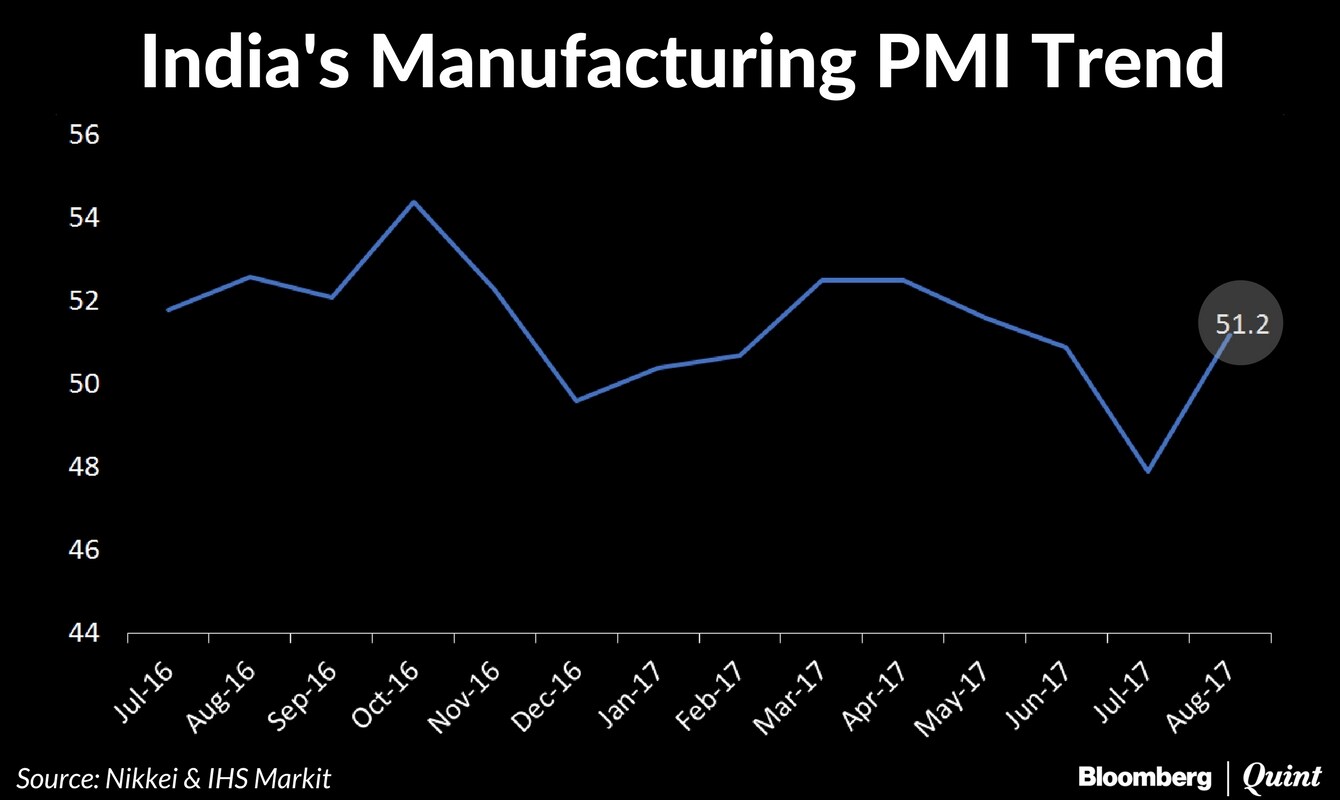 The Nikkei India Manufacturing Purchasing Managers' Index—compiled by Nikkei and research firm Markit—stood at 51.2, compared to 47.9 in July, according to the press release. A reading below 50 indicates a contraction and a number above it indicates expansion.