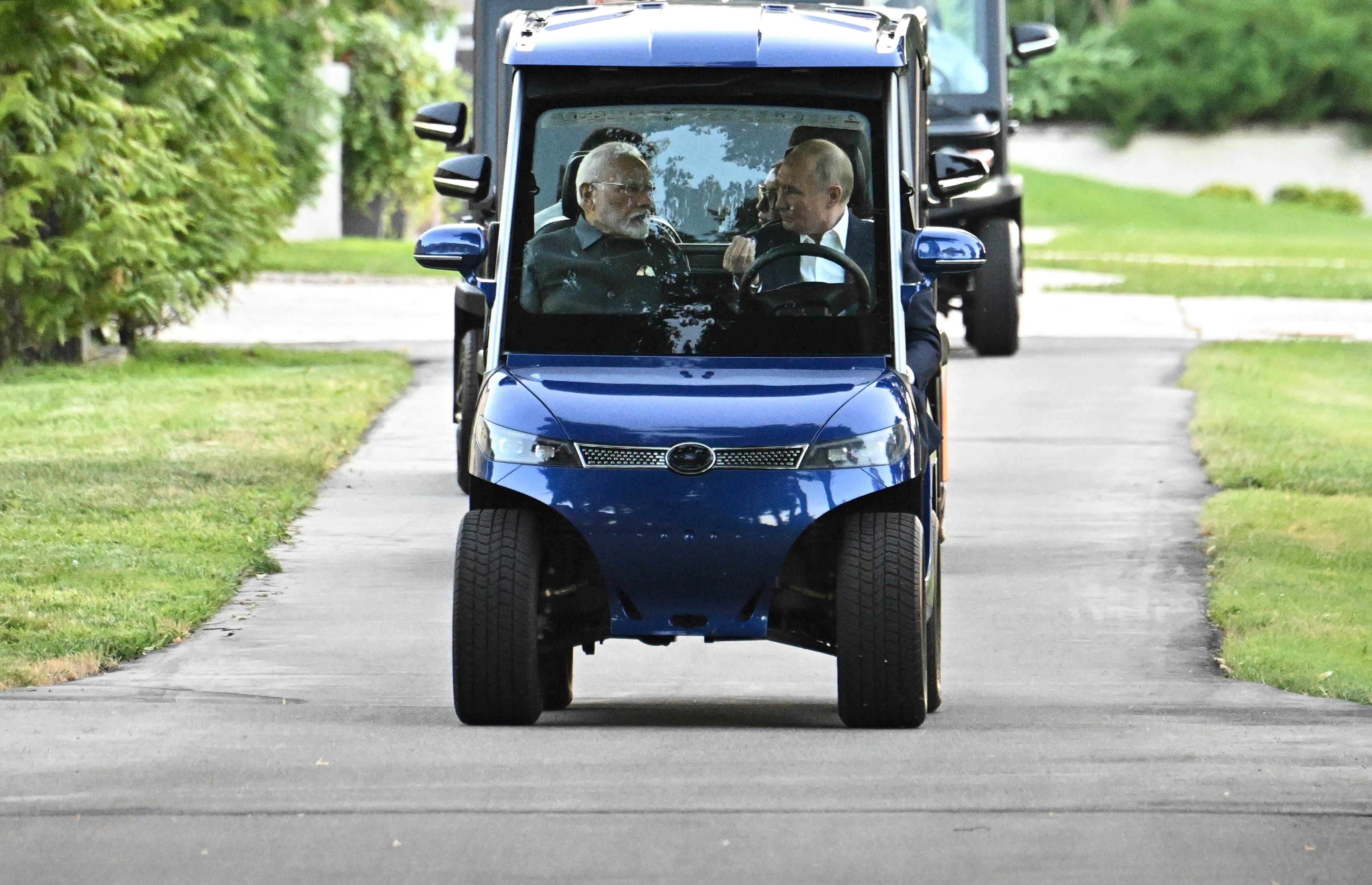Russian President Vladimir Putin, right, takes Indian Prime Minister Narendra Modi for a ride in a electric golf cart during an informal meeting at Novo-Ogaryovo residence, outside Moscow, Russia, Monday, July 8, 2024. (Source: AP/PTI)