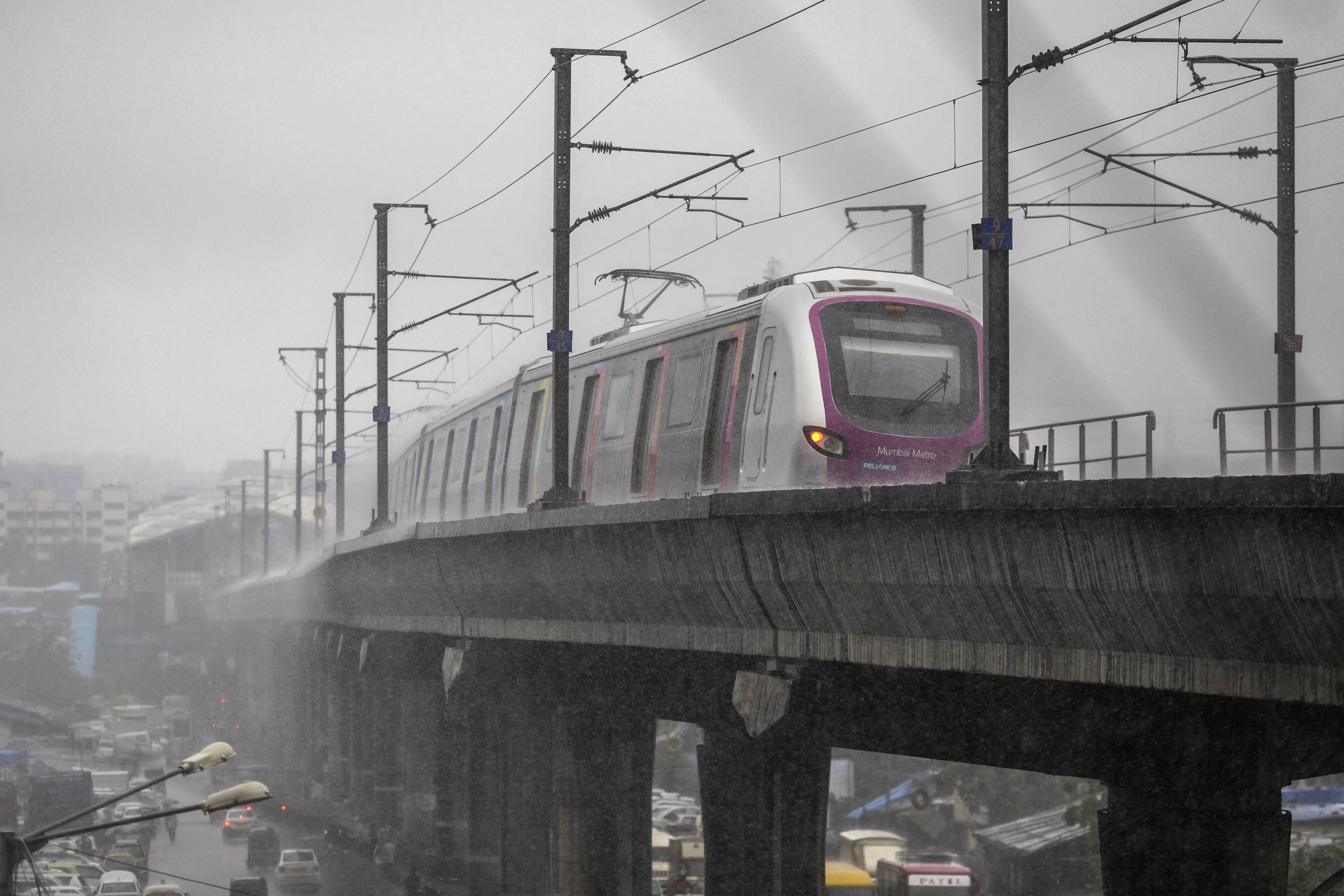 A train travels along a section of elevated track on Line 1, while it rains in Mumbai, August 2017. (Photographer: Dhiraj Singh/Bloomberg)