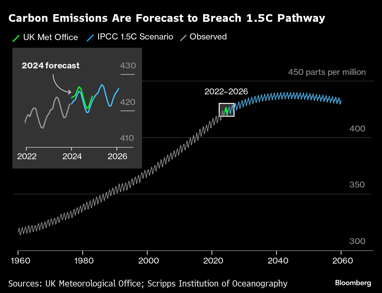 But this year's projected increase in CO2 concentration is well above all three 1.5C-compatible scenarios modeled by the IPCC, the Met Office said.