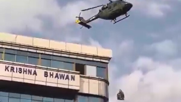 The video appears to be from the recent protests in Kathmandu, Nepal, where ministers were evacuated by military helicopters amid violence on September 9, 2025. The building sign "KRISHNA BHAWAN" aligns with locations there. No confirmed sources indicate it's from elsewhere.