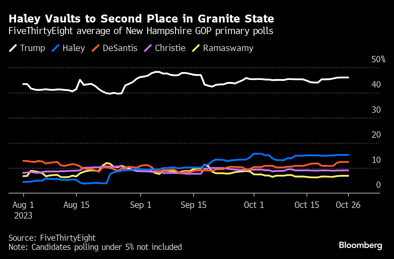 (Bloomberg) -- Rising international tensions are giving new life to Republican Nikki Haley's presidential campaign — but so far it hasn't been enough to vault her past her onetime boss, Donald Trump.