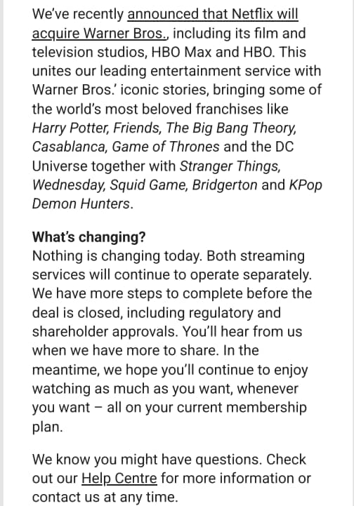 Netflix asked its subscriber to reach out to the Help Centre for more information in case of a query regarding its deal with the Warner Bros.