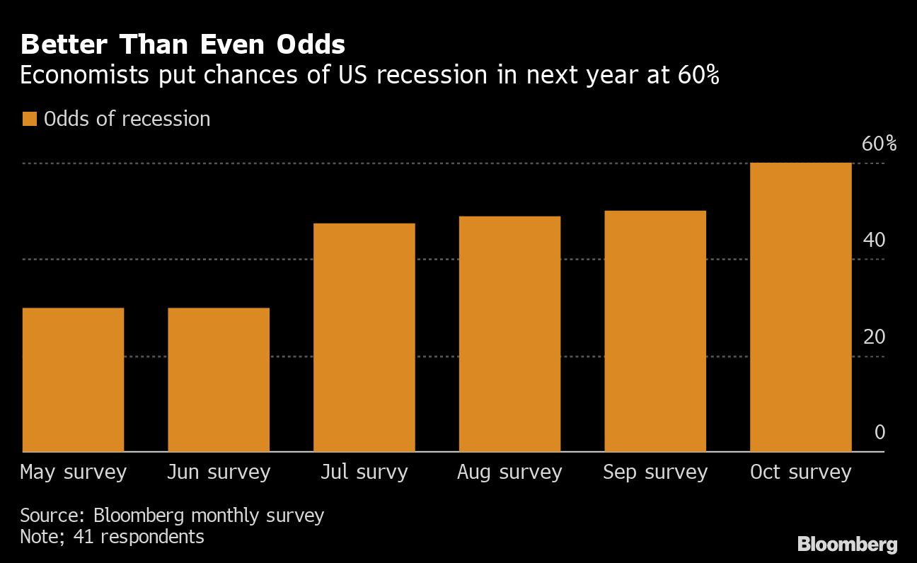 The probability of a downturn over the next 12 months stands at 60%, up from 50% odds in September and double what it was six months ago, according to the latest Bloomberg monthly survey of economists. The latest poll was conducted Oct. 7-12, with 42 economists responding about the chance of a recession.
