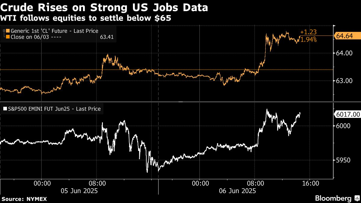 West Texas Intermediate climbed almost 2% to settle above $64 a barrel, notching the largest weekly gain since November. Crude followed equities higher after US job growth in May narrowly surpassed economist forecasts, allaying concerns of near-term demand deterioration. The figures also pushed economy-sensitive diesel futures to a two-week high.