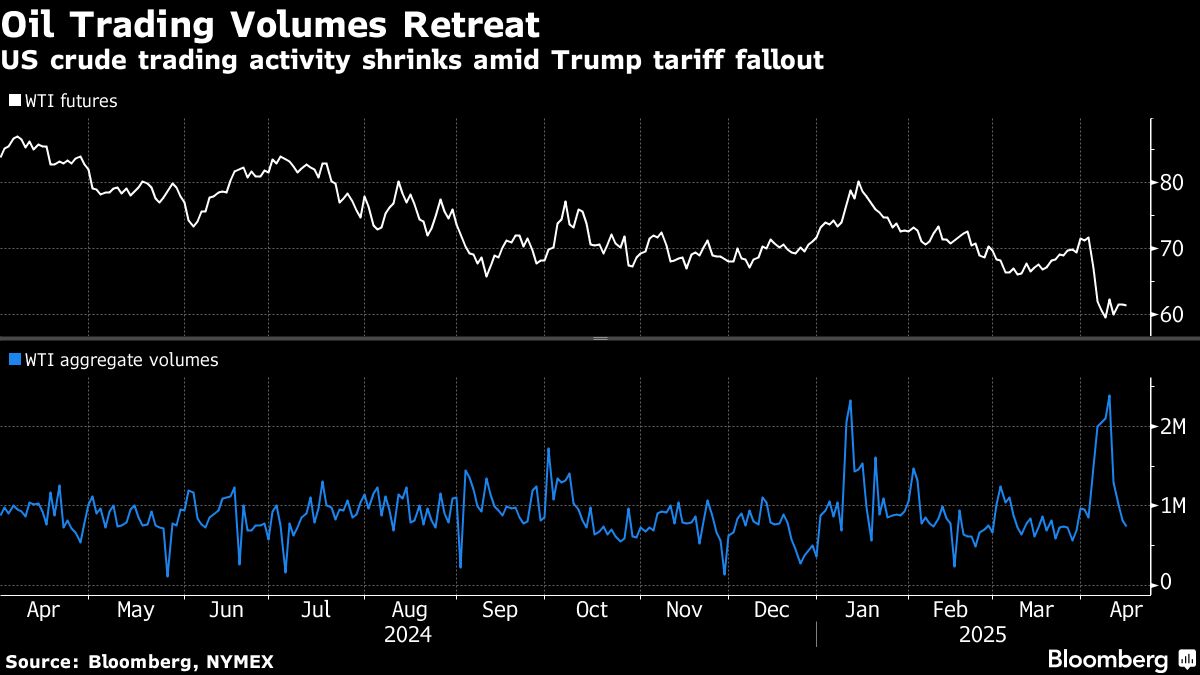 Investors pulling out of crude and fuel markets triggered a $2 billion net outflow in the week ending April 11, JPMorgan Chase & Co. analyst Tracey Allen wrote in a note to clients. Volumes across the futures curve have retreated to late March levels and WTI's open interest is fading after the initial spike as investors bail rather than test their luck predicting Trump's next tariff salvo.