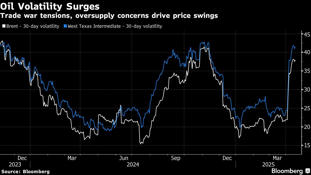 In that brief period, the oil market went from flatlining to experiencing huge price moves. The trigger was US President Donald Trump's April 2 unveiling of sweeping tariffs, escalating a trade war. Less than a day later, OPEC+ stunned markets with plans to boost output at a faster-than-anticipated rate. The dual shocks sent US crude futures down almost 7% for the biggest decline since Russia's invasion of Ukraine, while a key gauge of volatility rocketed to a six-month high.
