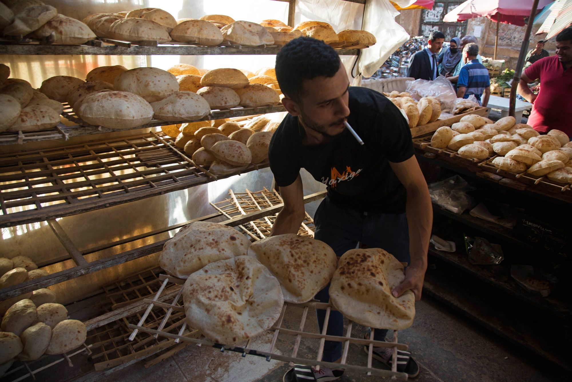A worker arranges freshly baked bread for sale at the Al-Monira market in Cairo, Egypt, on Wednesday, June 1, 2022.