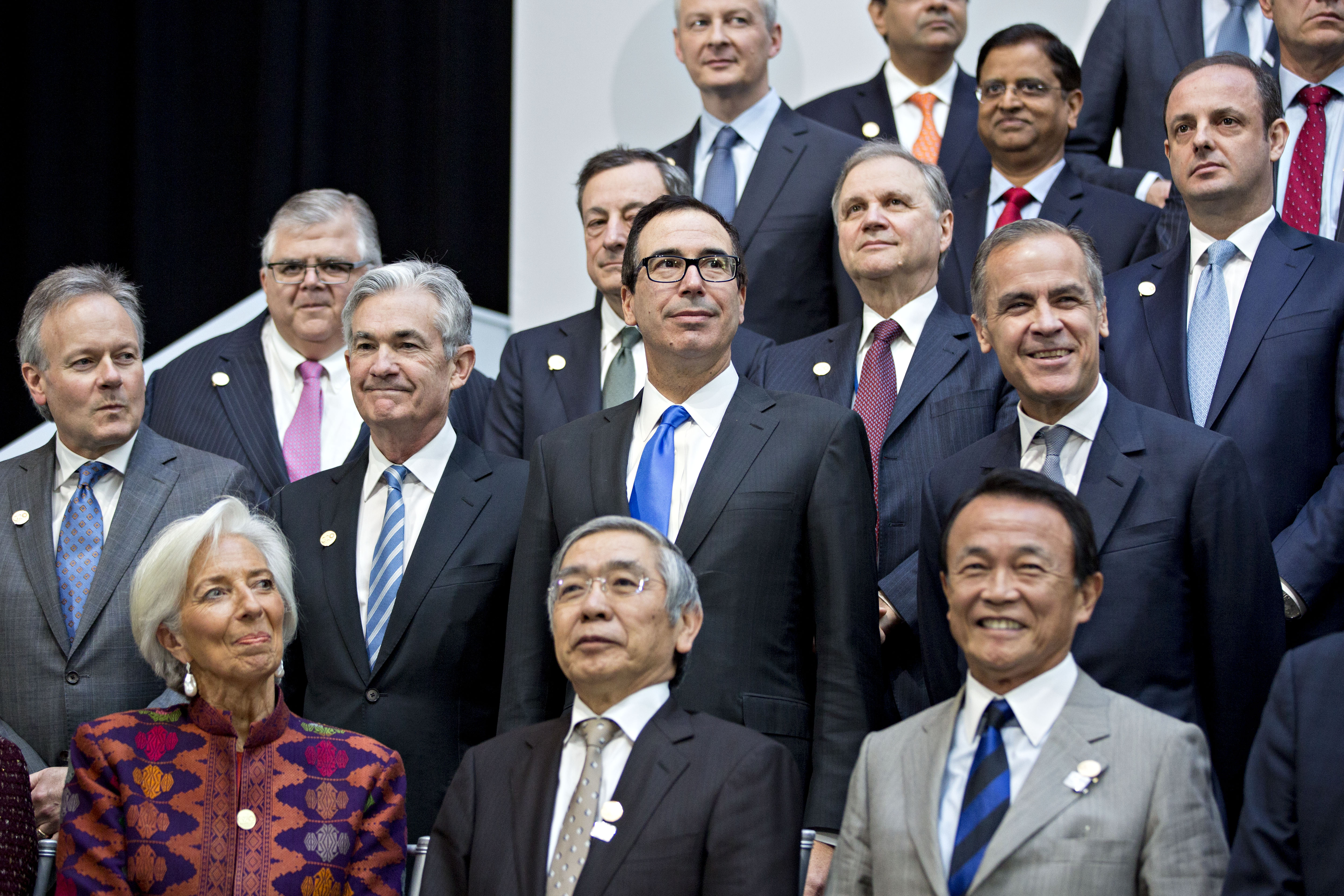 Stephen Poloz, governor of the Bank of Canada, middle from left, Jerome Powell, chairman of the U.S. Federal Reserve, Steven Mnuchin, U.S. Treasury secretary, and Mark Carney, governor of the Bank of England, attend a Group of 20 (G-20) finance ministers and central bank governors group photo on the sidelines of the spring meetings of the International Monetary Fund (IMF) and World Bank in Washington. (Photographer: Andrew Harrer/Bloomberg)