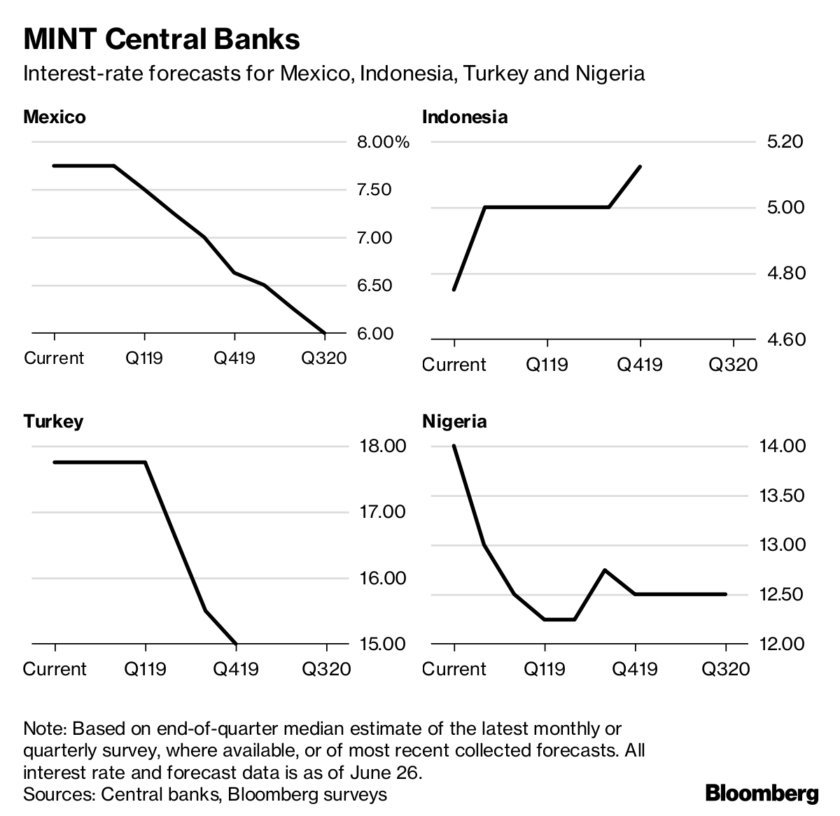 What Our Economists Say: “The central bank of Turkey is caught between President Erdogan and financial markets. The president has been vocally opposing high interest rates and his resistance will only intensify as economic growth slows down and he gains more power after the elections on June 24. Policy is tight, with borrowing costs up about 9.5 percentage points since the start of 2017. Still, the bank will probably keep rates on hold unless the currency nosedives again.”Ziad Daoud