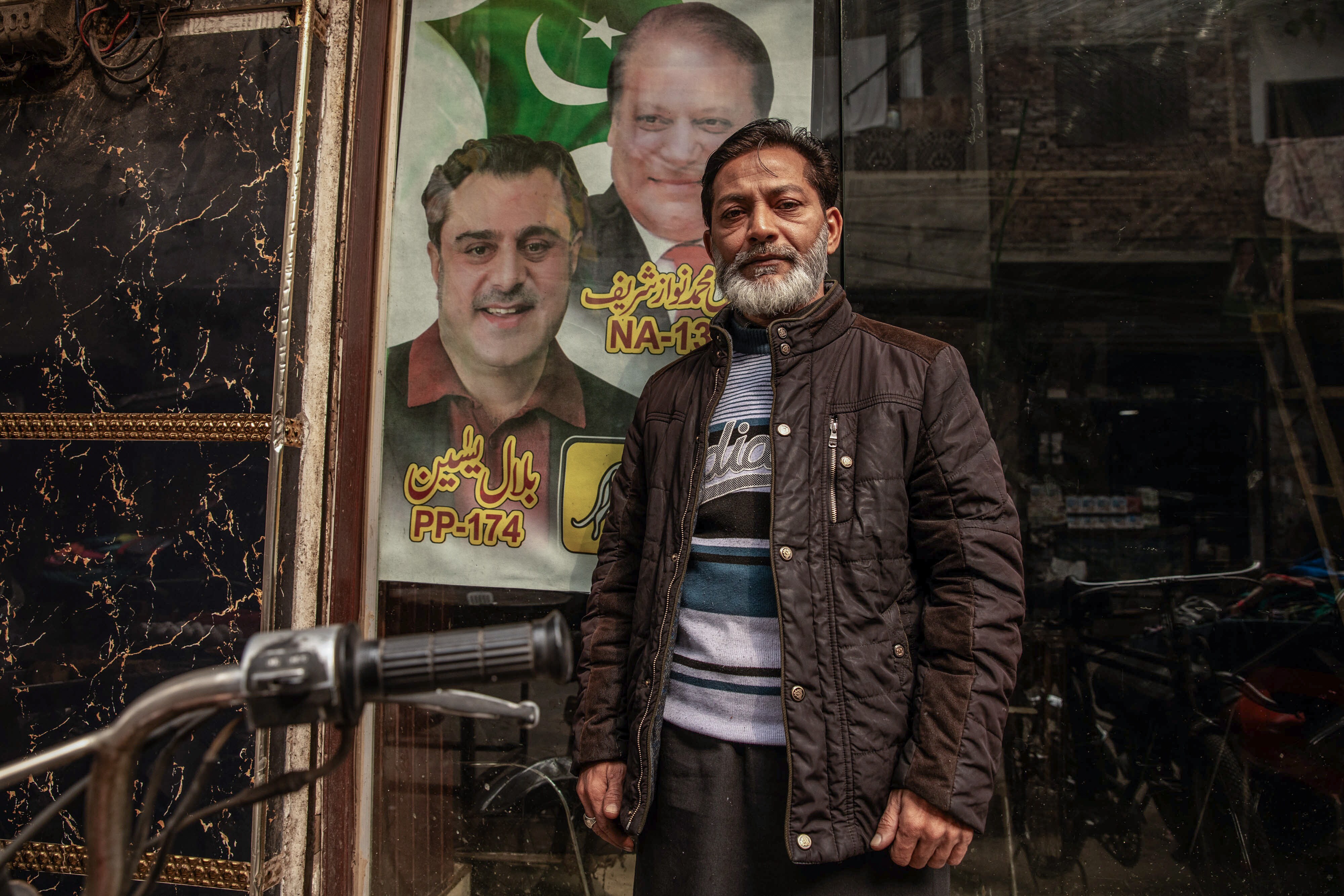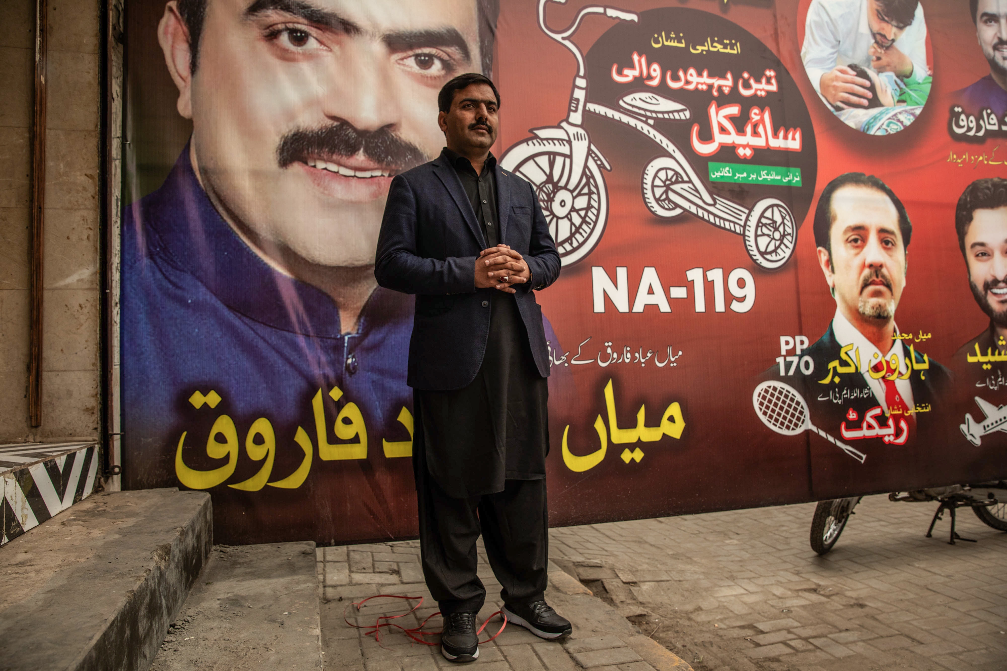 Tasawar Farooq in front of a campaign poster that includes his brother, candidate Shahzad Farooq, in Lahore on Jan. 25.Photographer: Betsy Joles/Bloomberg