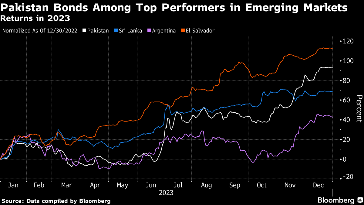 An index on Pakistan's dollar bonds gained 93% in 2023, the best performance in emerging markets after El Salvador. Pakistan may seek a fresh loan from the Washington-based lender to nurse its fragile economy, interim finance minister Shamshad Akhtar said in November.