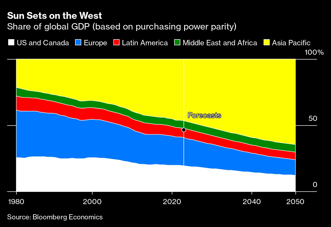 The rise of China in the past three decades has seen the balance of global power shift away from democratic free-market countries. Bloomberg Economics' projections suggest the trend will continue, with the share of global gross domestic product from Europe, the US and Canada sliding from 59% in 1989 to 41% in 2022, on a path to 24% in 2050. For the global economy, it makes sense to think about that shift as triggering two types of problems: short-fuse blowups when tensions between the two sides erupt, and slow-burn costs as they move farther apart.