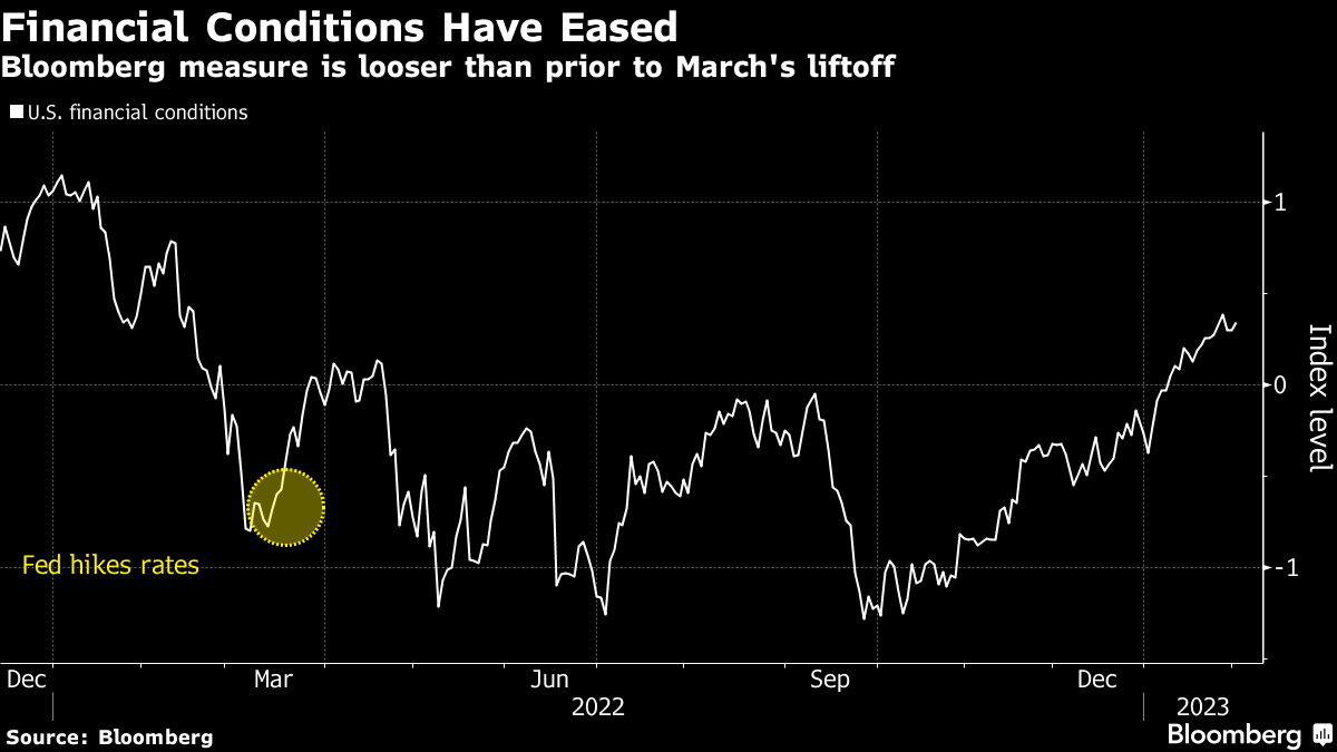 The emphasis on tighter conditions is being taken by traders as evidence the latest rallies in equities and credit are not a major concern for policy makers, essentially freeing them to bid up prices. Some analysts question what measure Powell was referring to — a Bloomberg index of US conditions across markets sits today at a looser level than it was when the Fed began its tightening campaign last year.
