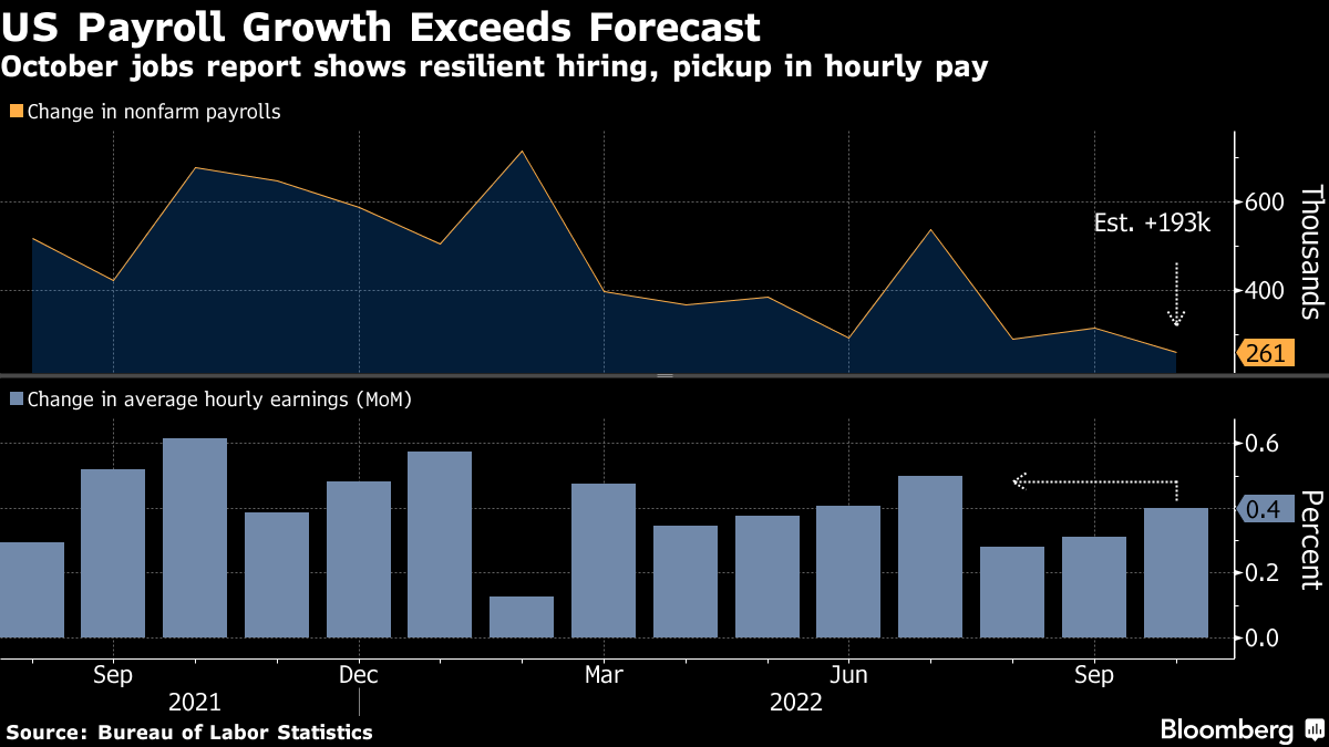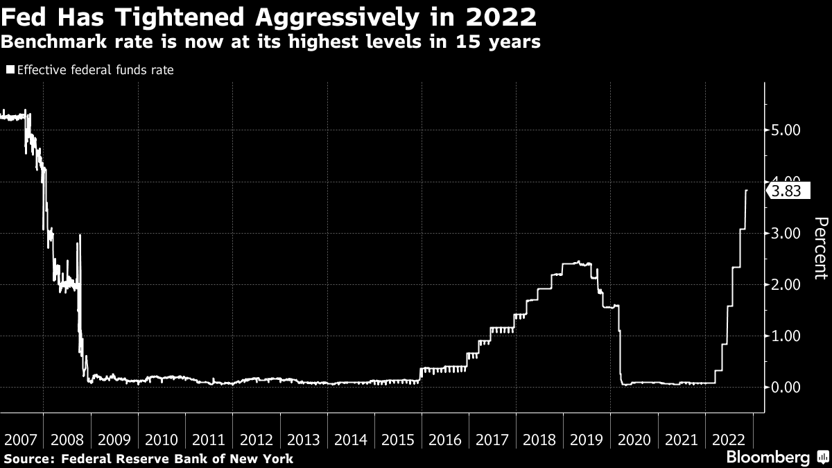 Investors expect the Fed to slowdown next month with rates peaking around 5% next year from the current ratnge of 3.75% to 4.00%, according to pricing of contracts in futures markets.