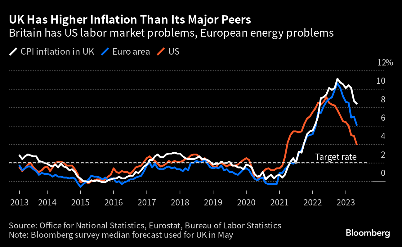 While inflation is coming down as energy costs subside, it is doing so more slowly than the BOE predicted. Figures next week are forecast to show it remained well above 8% in May. Traders are pricing in the possibility that interest rates hit 6%, the highest in more than two decades.