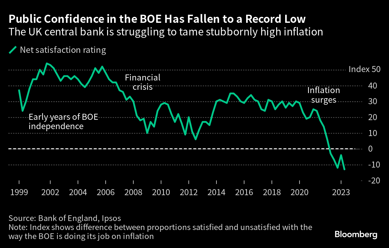 (Bloomberg) -- Public confidence in the Bank of England is at an all-time low as officials struggle to get a grip on inflation, a survey found.