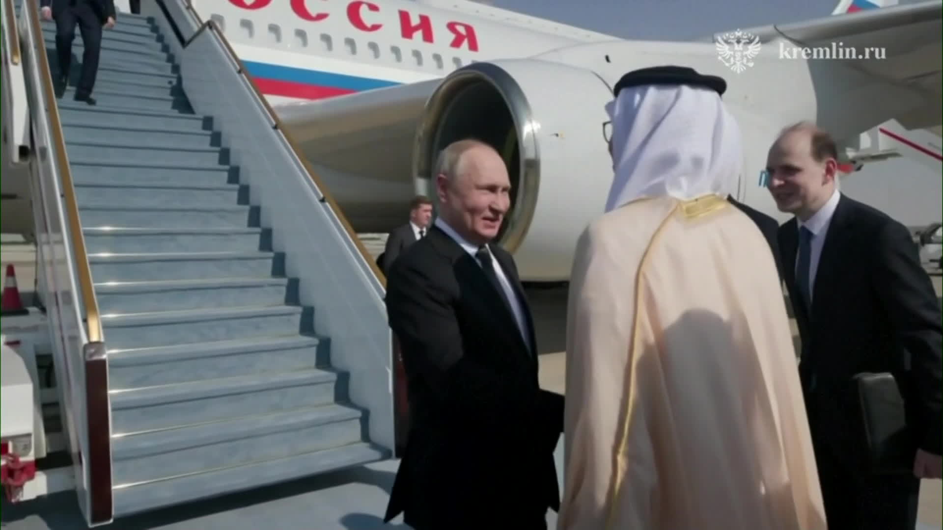 Upon arrival, Putin was greeted by senior UAE officials and treated to a flyover by the “Emirates Knights” national air show team, leaving vapor trails in the colors of the Russian flag behind them. Artillery fired 21 rounds to welcome the Russian leader, according to WAM.