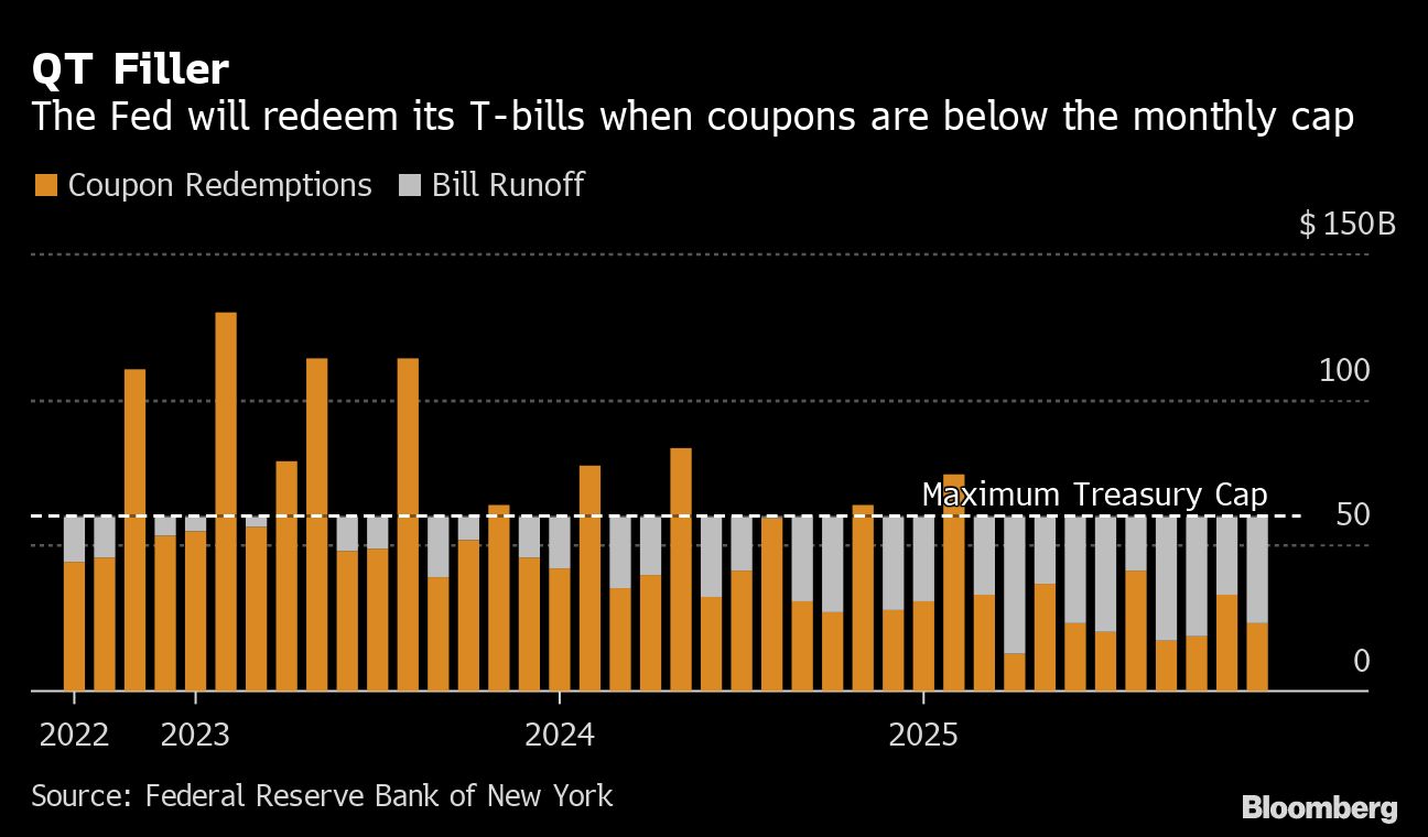There's been keen interest in the Fed's bill holdings due to the fact that the last time the monetary authority undertook so-called quantitative tightening it didn't own any of the securities. It's also critical for money-market traders who have been struggling to find assets in which to invest. They've largely opted to park excess cash at the reverse repurchase agreement facility, and a full rundown of the Fed's Treasury bills would've provided investors with a jolt of supply.