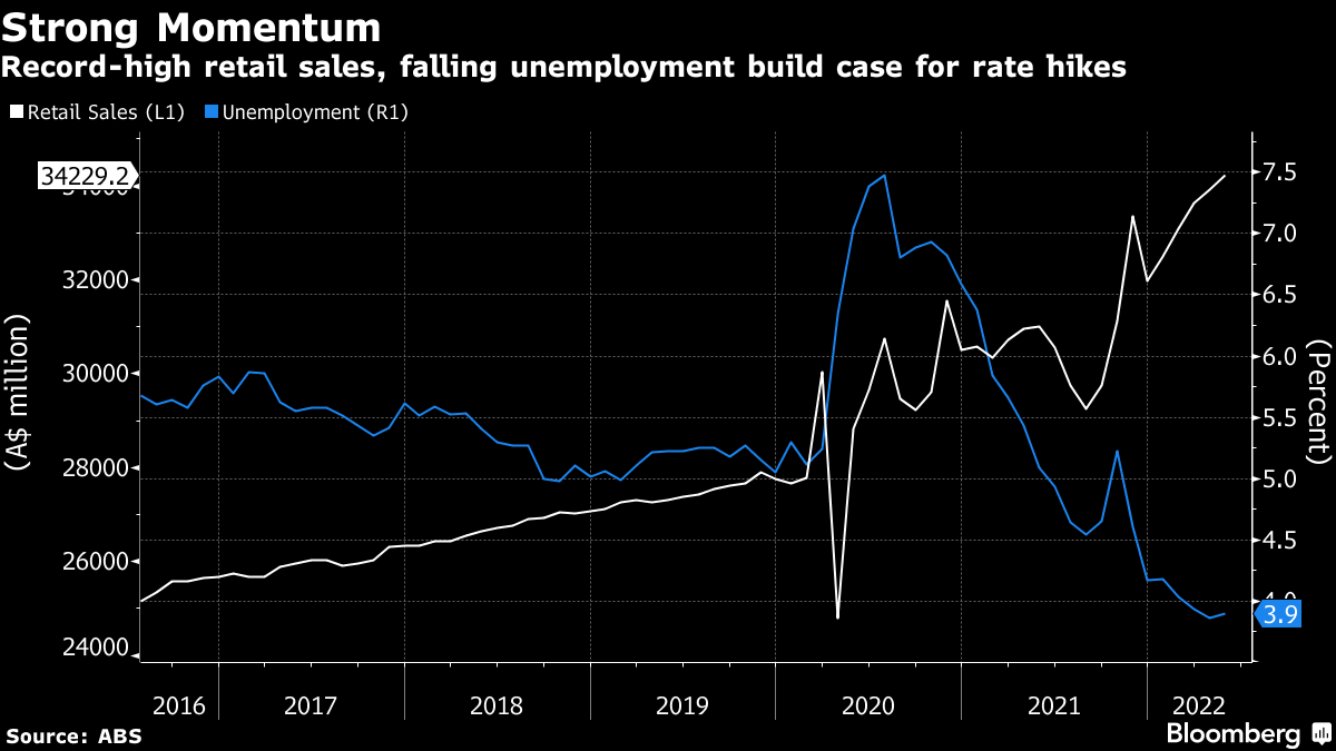 So far, consumption has been robust, with recent card-spending data from Australia's biggest banks suggesting another solid month of sales in June. Moreover, job vacancies are at record highs, indicating further falls in unemployment that's already near the lowest in almost 50 years.