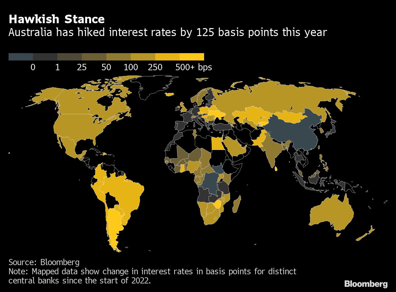 The RBA has boosted borrowing costs 125 basis points since May, piling pressure on consumers who are among the most indebted in the world. Lowe has warned that the benchmark rate may go to 2.5% while money markets pricing implies a peak this year of about 3.2%, raising concern the economy could tip into recession.
