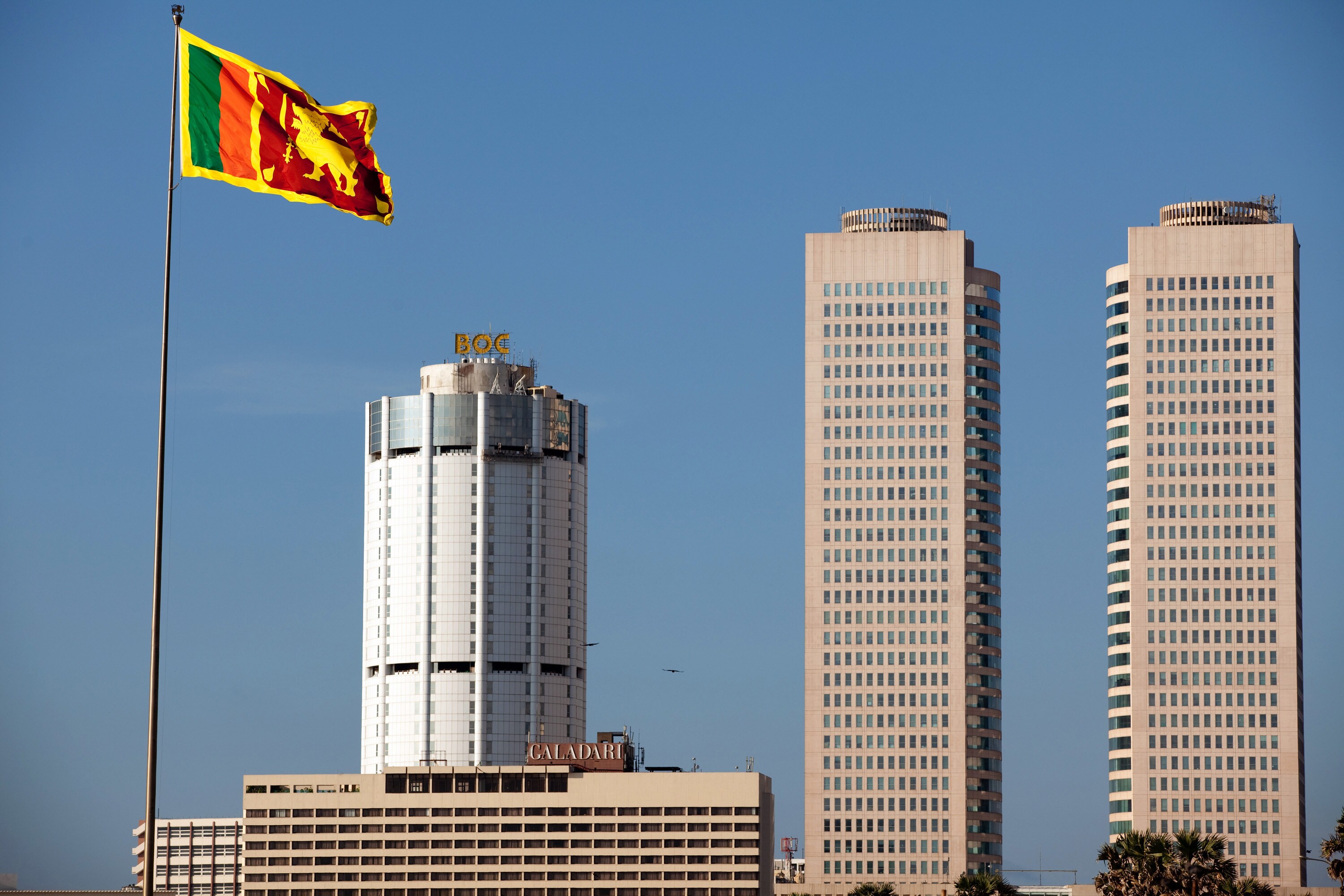 The Sri Lankan flag flies in front of the Bank of Ceylon, left, and the World Trade Towers in Colombo, Sri Lanka. (Photographer: Prashanth Vishwanathan/Bloomberg)