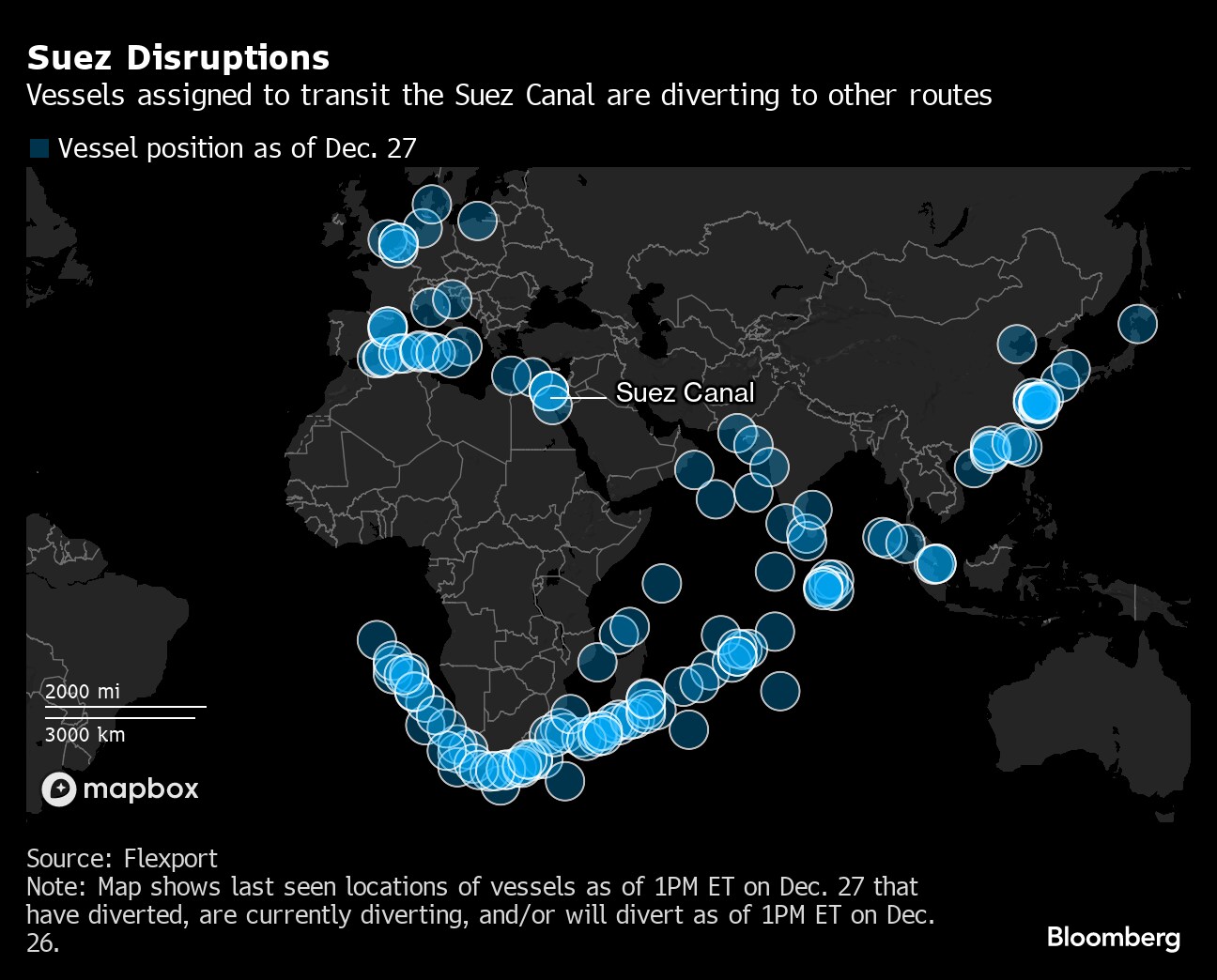 The trend in Flexport's numbers mirrors a separate count by Swiss freight-forwarder Kuehne + Nagel International AG that, as of Wednesday, showed 364 vessels with capacity for 5 million 20-foot containers being rerouted around Africa. That compares with 314 vessels on Dec. 22.