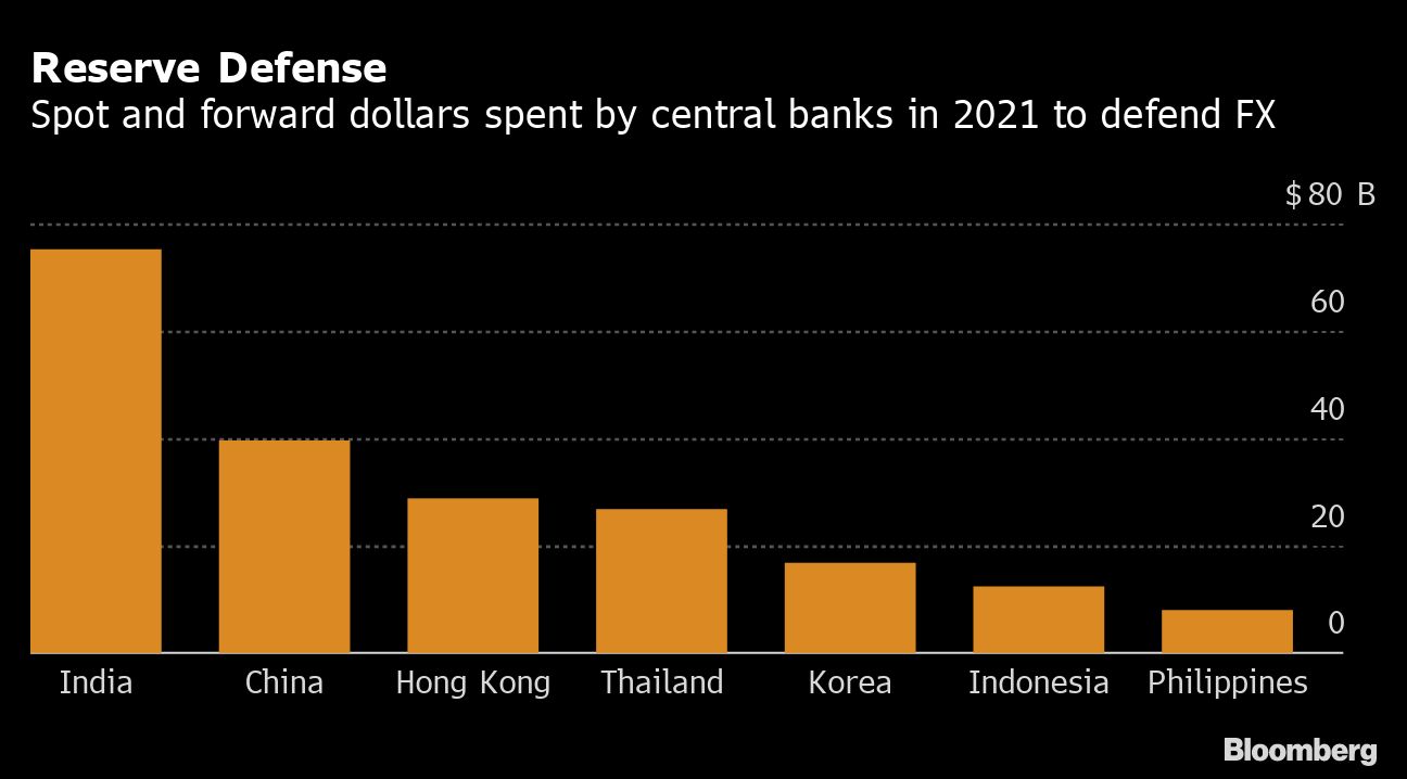 India is already estimated to have spent $75.1 billion this year supporting the rupee in the spot and forward markets, while China has probably spent $39.6 billion, Thailand $26.9 billion and South Korea $16.7 billion, according to Nomura's estimates to the end of August. Both the Reserve Bank of India and Bank of Thailand have used up more than 10% of their end-2021 headline reserve levels, the bank said.