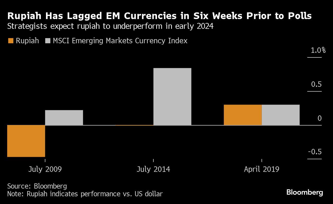 Historically, the rupiah has underperformed peers in the run-up to the elections. The concerns this time are also stemming from a change of guard after a decade. Worries over political stability and policy continuity may weigh on the currency as the nation prepares to choose President Joko Widodo's successor.