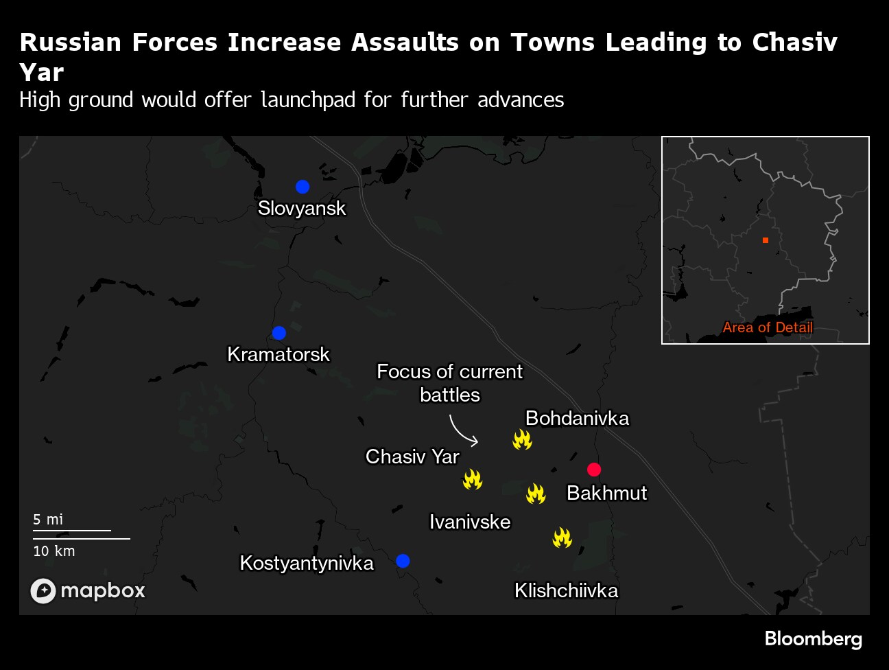 Russia stepped up attacks in the east of Ukraine, advancing toward the strategically-important city of Chasiv Yar in the Donetsk area as Kyiv rushed troops to bolster defenses on the new northeastern front near Kharkiv.
