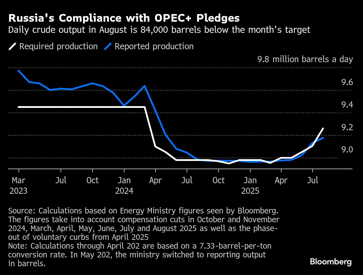 Russia's August production was much closer to its target level under the previous compensation schedule published in April, which required the nation to pump 9.181 million barrels a day, Bloomberg calculations show.