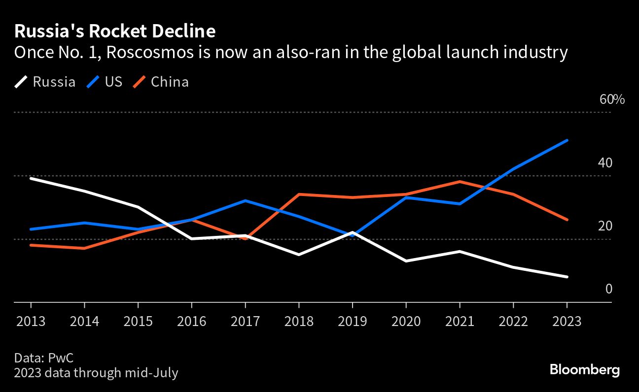 Roscosmos has experienced further damage as a result of President Vladimir Putin's invasion of Ukraine last year. The country's space partnerships nearly evaporated and satellite operators including OneWeb Ltd. canceled launches.