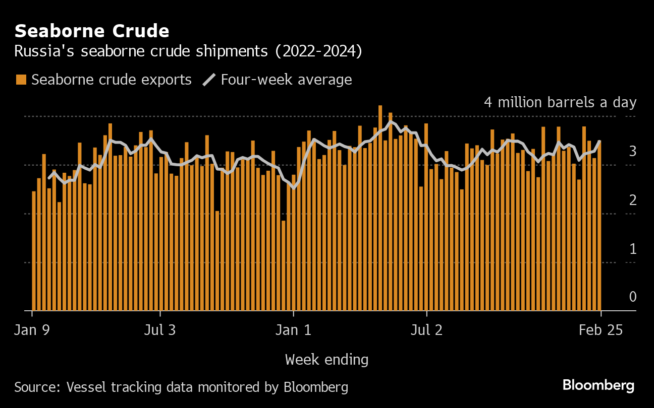 A total of 32 tankers loaded 24.5 million barrels of Russian crude in the week to Feb. 25, vessel-tracking data and port agent reports show. That was up by about 2.5 million barrels from the previous week.