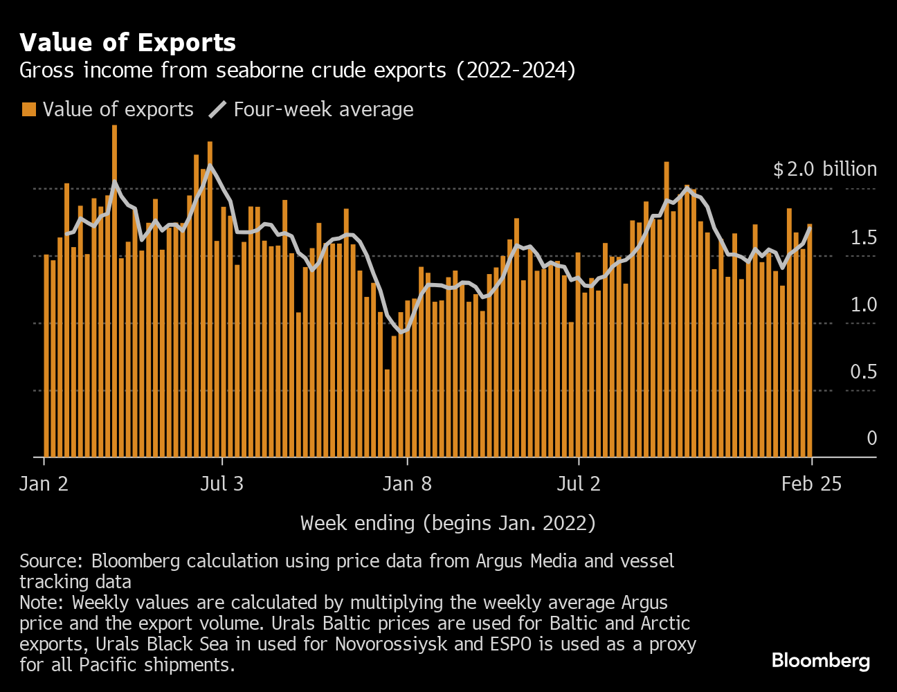The gross value of Russia's crude exports rebounded to a three-week high, rising to $1.73 billion in the seven days to Feb. 25 from $1.55 billion the previous week. Meanwhile four-week average income continued to rise, up by $115 million to $1.7 billion a week.