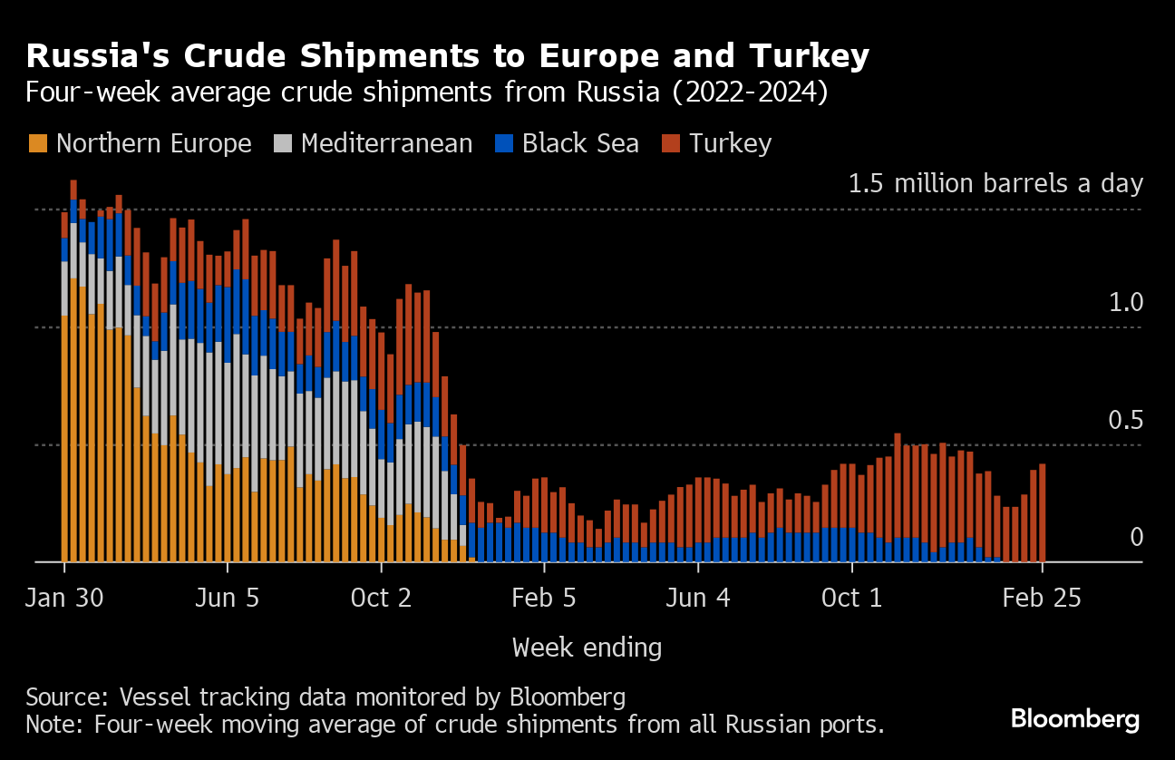 Exports to Turkey recovered to an 11-week high of about 417,000 barrels a day in the four weeks to Feb. 25. That's the highest since the week ended Dec. 5 and up from a revised figure of about 390,000 barrels a day in the period to Feb. 18.