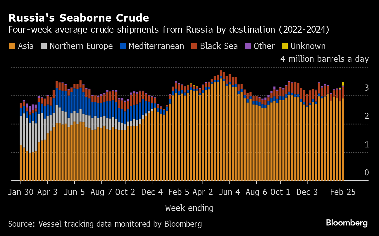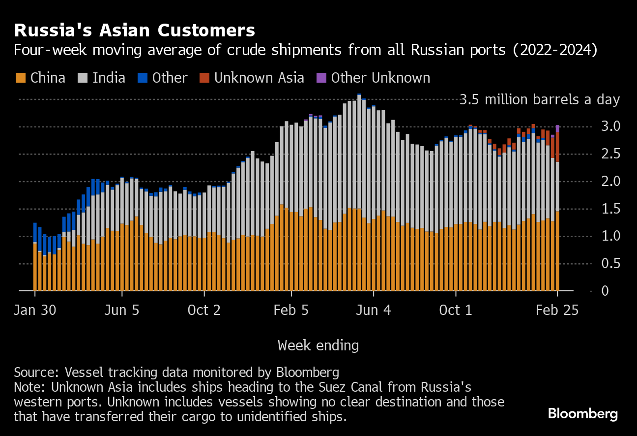 Observed shipments to Russia's Asian customers, including those showing no final destination, rose to a five-week high of 3.02 million barrels a day in the four weeks to Feb. 25, up from a revised 2.85 million in the previous four-week period.