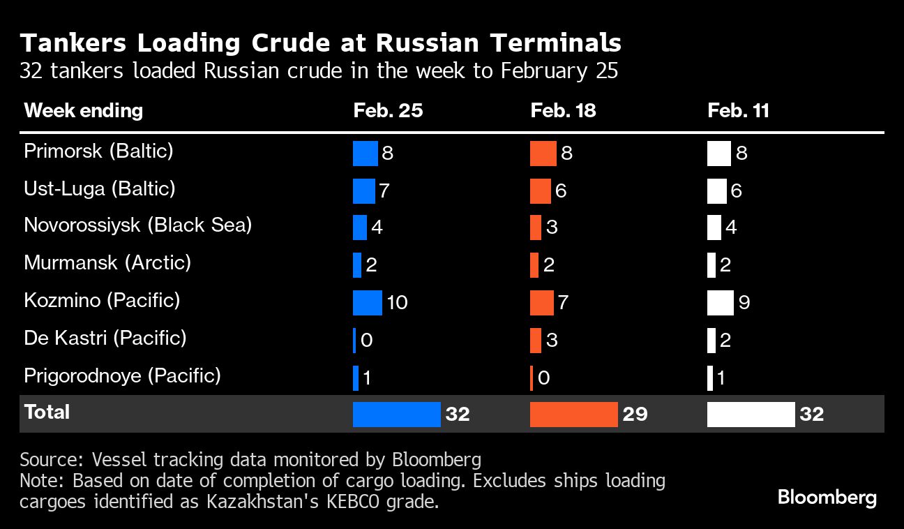 A total of 32 tankers loaded 24.5 million barrels of Russian crude in the week to Feb. 25, vessel-tracking data and port agent reports show. That was up by about 2.5 million barrels from the previous week.