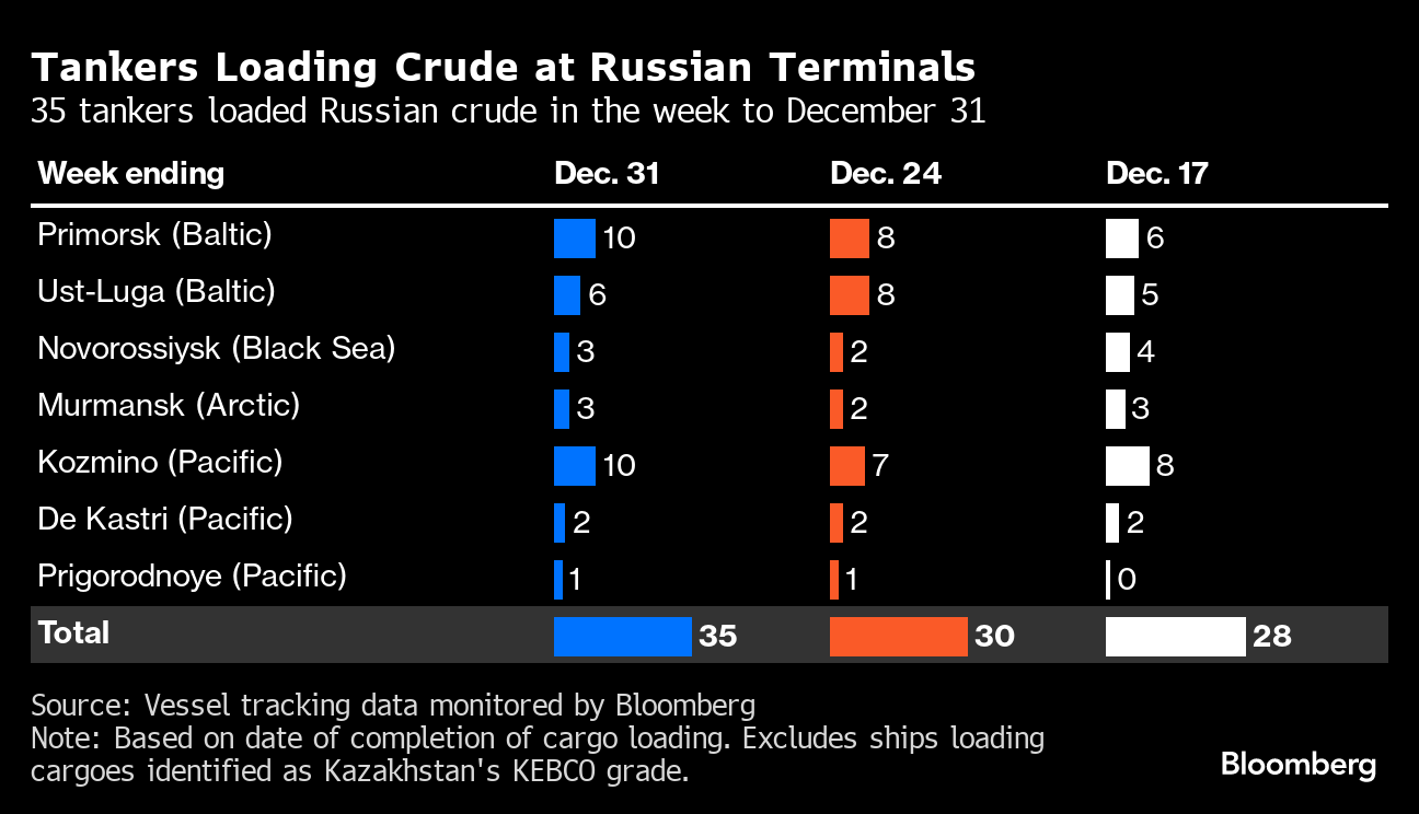 A total of 35 tankers loaded 26.5 million barrels of Russian crude in the week to Dec. 31, vessel-tracking data and port agent reports show. That's up by about 3.9 million barrels from the figure for the previous week and the highest weekly amount since July.