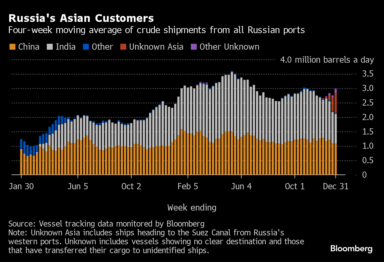 Observed shipments to Russia's Asian customers, including those showing no final destination, rose to 2.99 million barrels a day in the four weeks to Dec. 31, up from 2.75 million barrels a day in the period to Dec. 24. They were the highest since October.