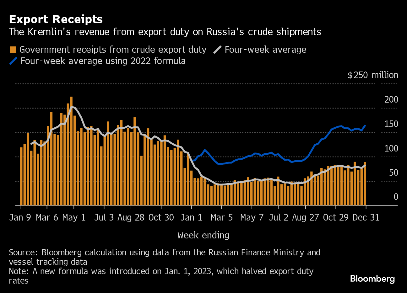 Inflows to the Kremlin's war chest from its crude-export duty rose to $89 million in the seven days to Dec. 31. Meanwhile four-week average income also gained, increasing by $5 million to a five-week high of $82 million, its highest in a year.